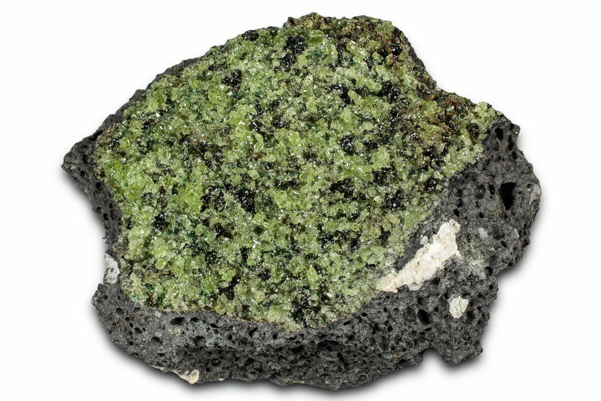 This is a 4.8" wide specimen of peridot crystals in basalt, containing both light and dark green olivine peridot, collected from the San Carlos Apache Reservation in Arizona.