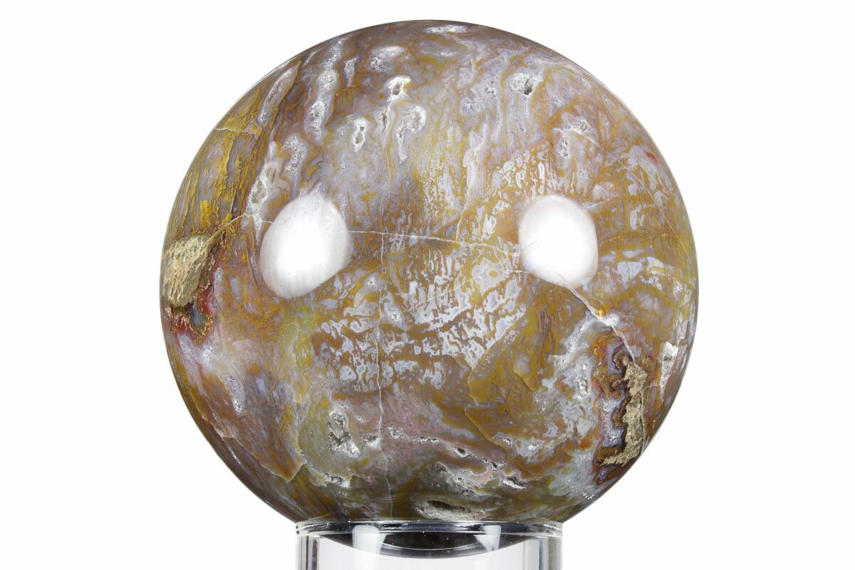 This is an alluring, 4.8" wide sphere made from a large, solid piece of moss agate. It contains beautiful orange and red moss-like filaments scattered throughout, with spots of banded agate. The entire specimen has been flawlessly polished to a glossy finish all the way around.