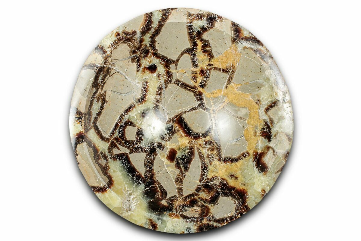 This is a beautiful, 4.8" wide decorative dish/bowl made of hand polished septarian. The septarian comes from the Betsiboka Region of Madagascar and was deposited during the Jurassic period.