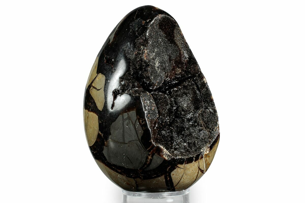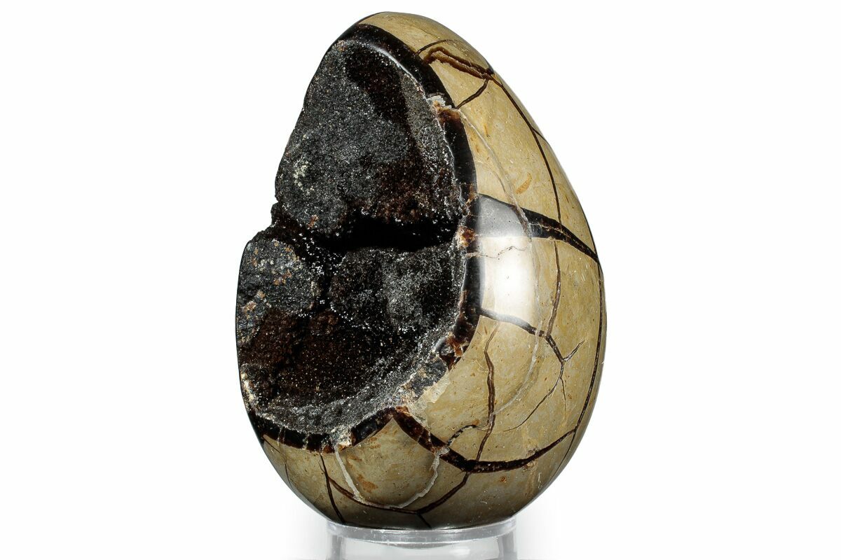 This is a gorgeous septarian "dragon egg" geode collected in the Betsiboka Region of Madagascar. The hollow cavity is full of beautiful, sparkling black & brown calcite crystals. It is a hollow septarian nodule which has been polished into an egg shape, and the natural cracked pattern of the septarian gives it the appearance of a dragons egg. A spectacular display piece which would look great in your home/office or make a great gift for the Game of Thrones enthusiast you know.