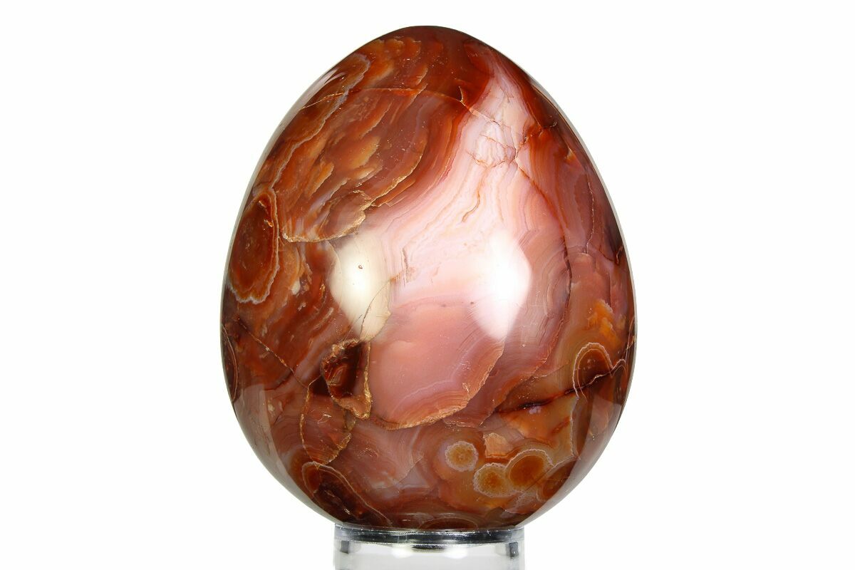 This is a richly colored polished egg, shaped from carnelian agate. The carnelian is mined in Madagascar and has wonderful deep red, white, and orange colors. Comes with an acrylic ring display stand.