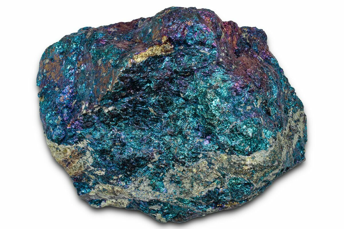 Often called “Peacock Ore” for its vivid, iridescent colors, this material is actually chalcopyrite that has been treated with acid. The treatment replicates a natural process that forms the much rarer copper mineral bornite.