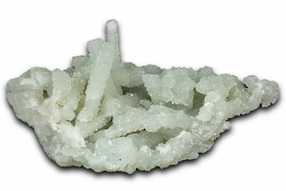 These prehnite pseudomorphs after laumontite are striking, sculptural mineral specimens in which prehnite has completely replaced the original laumontite crystals while preserving their form. These pieces often display sharp, chiseled, blade-like shapes inherited from the former zeolite, now transformed into smooth, translucent prehnite with soft green to yellow-green hues.