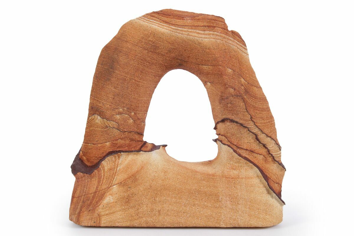 This is a 4.9" wide Toroweap picture sandstone arch. This stunning and distinctive sandstone, mined near Snowflake, Arizona, has been artistically crafted into an arch shape, inspired by natural sandstone formations like Delicate Arch in Arches National Park. The base of this specimen has been cut flat for vertical presentation.