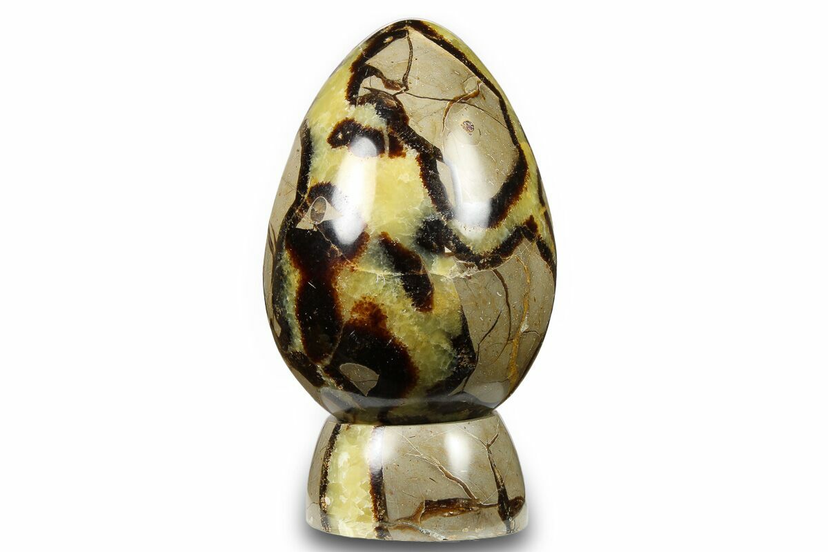 This is a beautiful, hand-polished egg and stand that were both sculpted from septarian. The septarian comes from the Betsiboka Region of Madagascar and was deposited during the Jurassic period. The polishing reveals a beautiful pattern of yellow calcite, brown aragonite, and grey-brown limestone. The polished septarian base has a concave depression that the egg sits upright within, creating this aesthetic display.