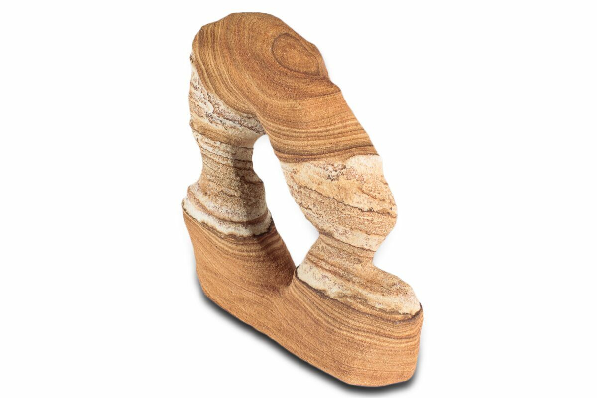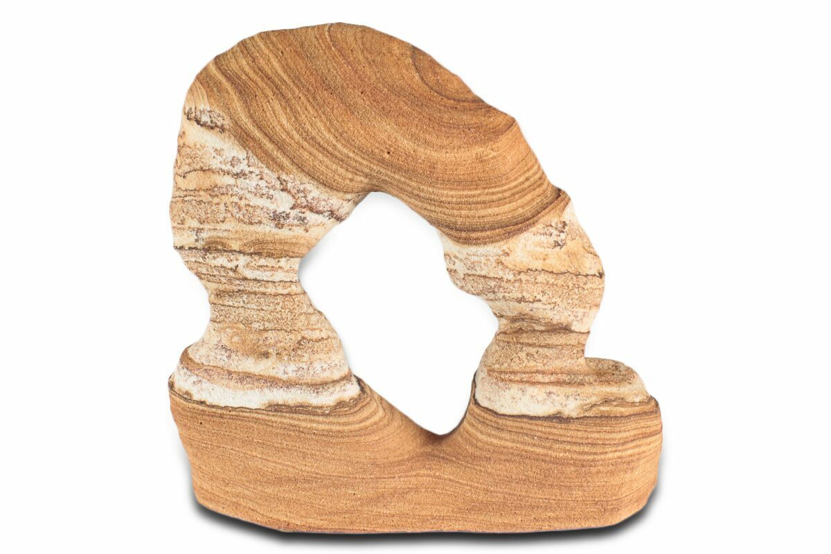 This is a 4.95" wide Toroweap picture sandstone arch. This stunning and distinctive sandstone, mined near Snowflake, Arizona, has been artistically crafted into an arch shape, inspired by natural sandstone formations like Delicate Arch in Arches National Park. The base of this specimen has been cut flat for vertical presentation.