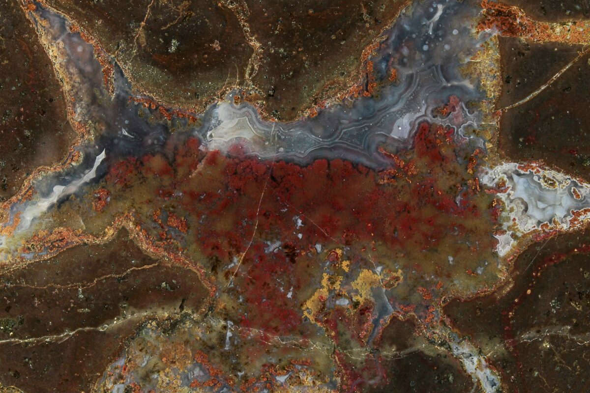 This is a gorgeous thunderegg half, collected from 79 Bed near McDermitt, Nevada. This unique specimen features a core which is filled with white to light blue chalcedony. It also contains beautiful orange and red moss-like filaments.
