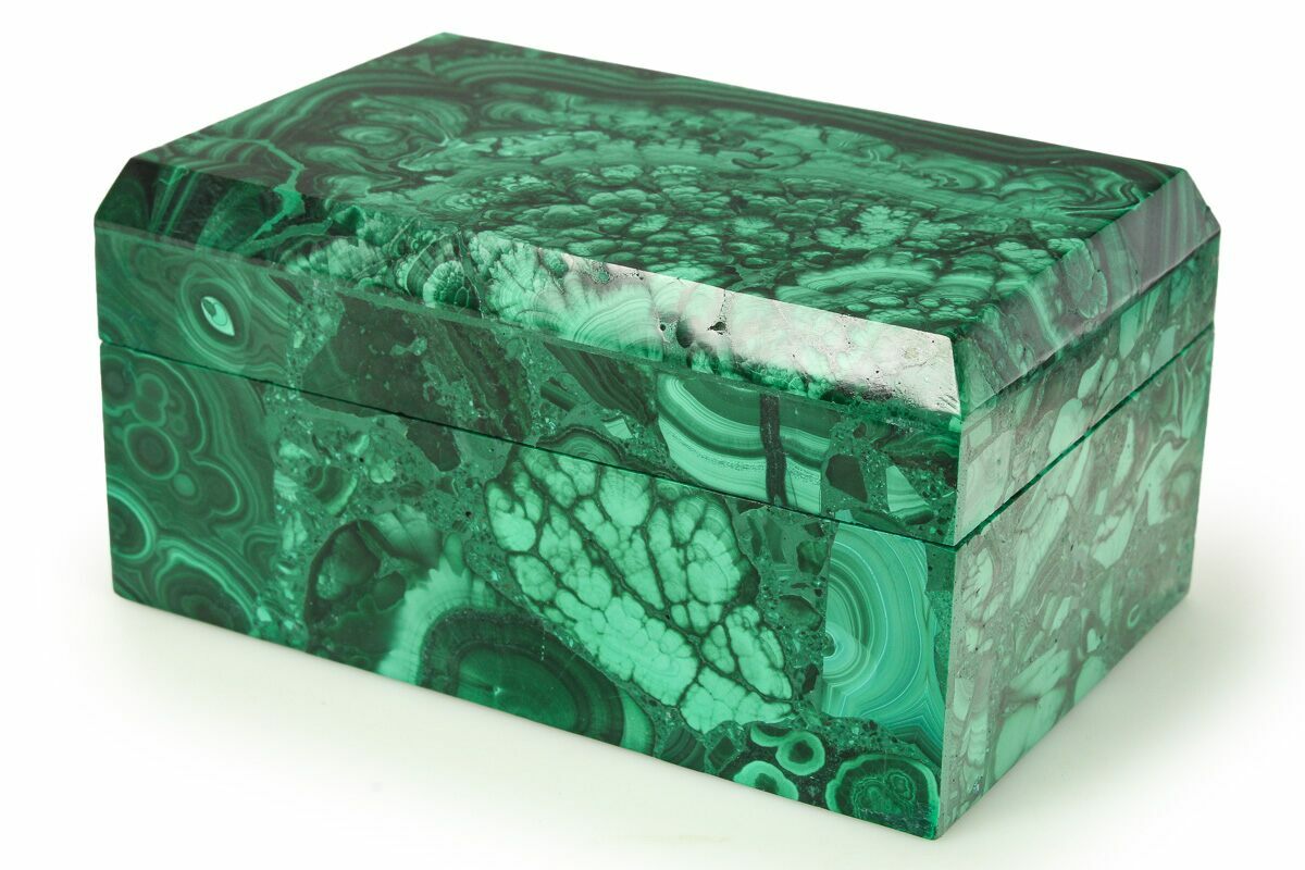 This is an absolutely gorgeous jewelry box with a removable lid, made from slabs of polished, flowery malachite. The external dimensions of this jewelry box are 4 x 2.5 x 2"