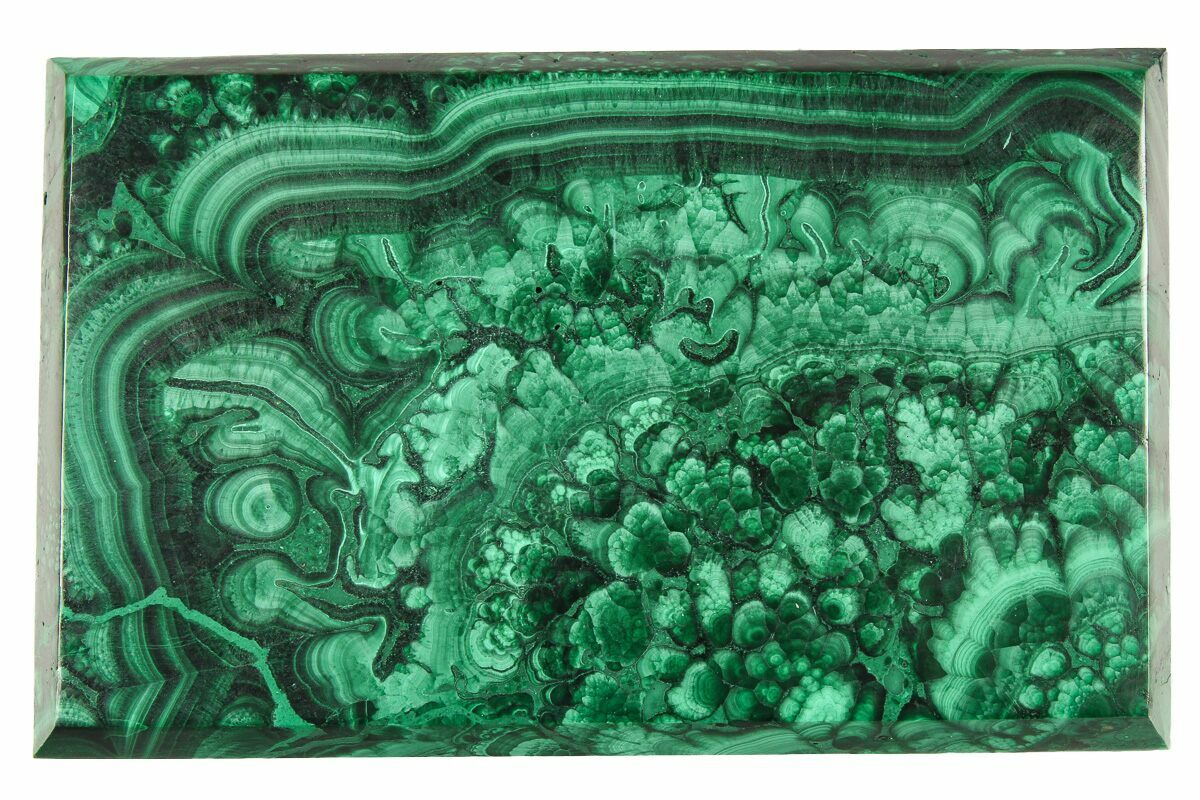 Malachite is an intense green copper-based mineral that can be found in a wide variety of forms. Malachite can grow in botryoidal masses, stalactitic formations, and reniform formations, typically as a tight cluster of fanning fibrous needles that make up a seemingly solid mass. As layers continue to stack during formation, banded patterns can sometimes begin to take shape, explaining the rings in all shades of green seen on most polished malachite specimens.