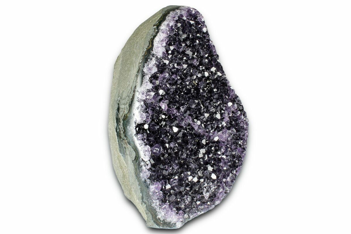 This is a 4" grape-jelly purple amethyst geode section from the famous amethyst mines in Artigas, Uruguay. The base has been cut flat so that it stands up nicely on a flat surface.