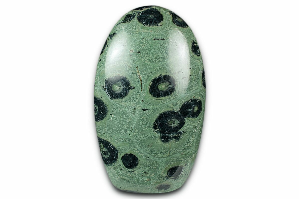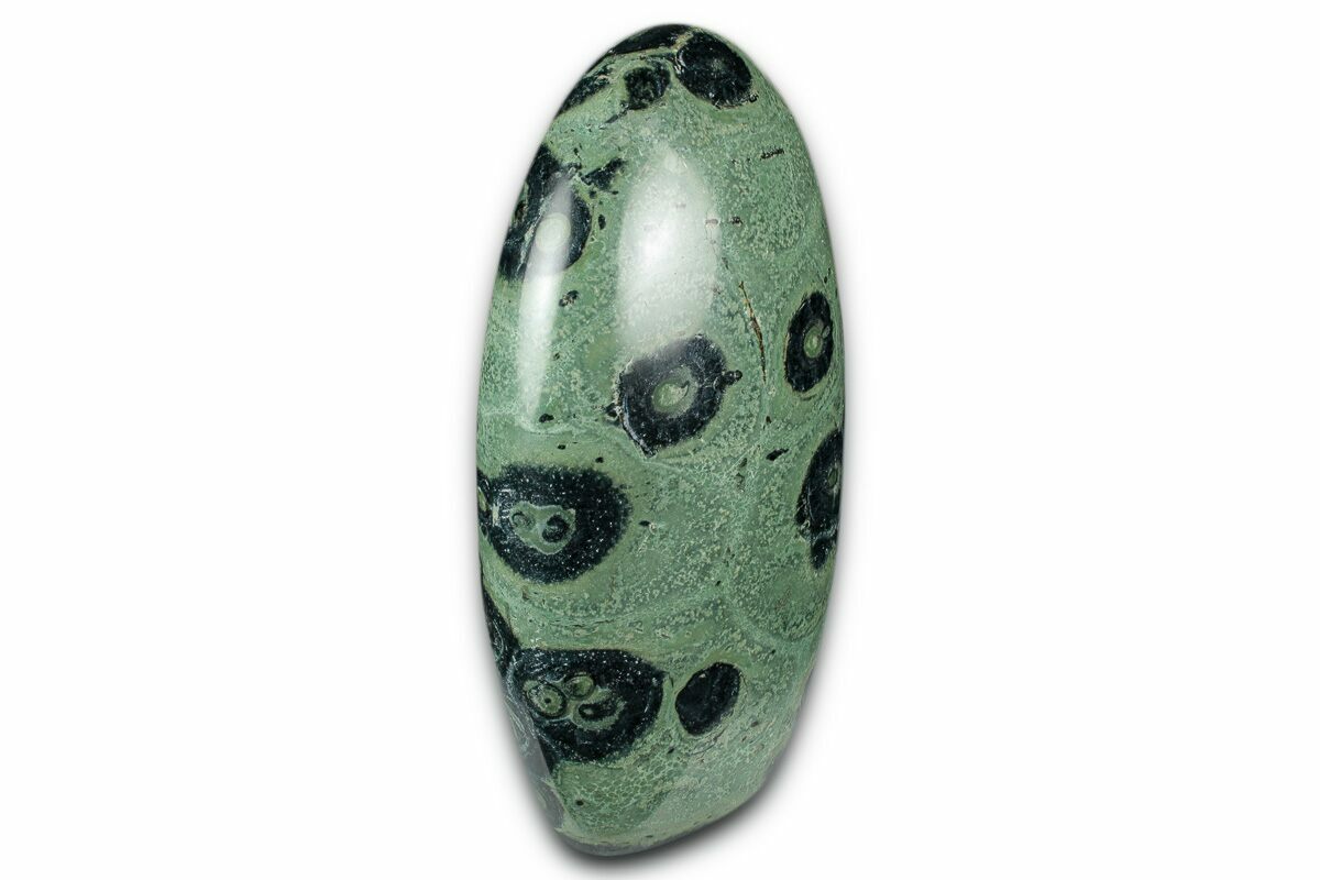 This is a 4" tall, polished piece of Kambaba Jasper from Madagascar, shaped so the base sits flat for effortless display on any surface. The stone features the distinctive deep green and black orbicular patterns. A striking addition to any mineral collection or décor setting, it stands beautifully on its own as a natural work of art.