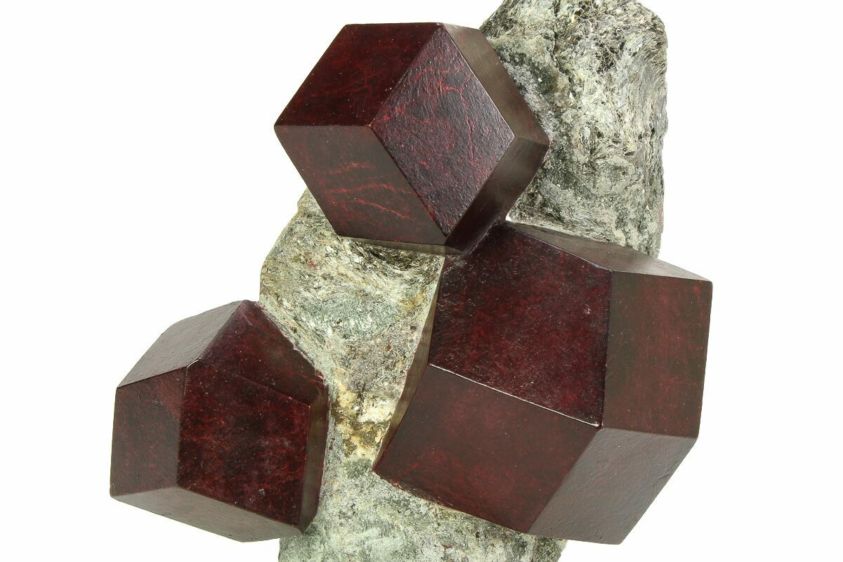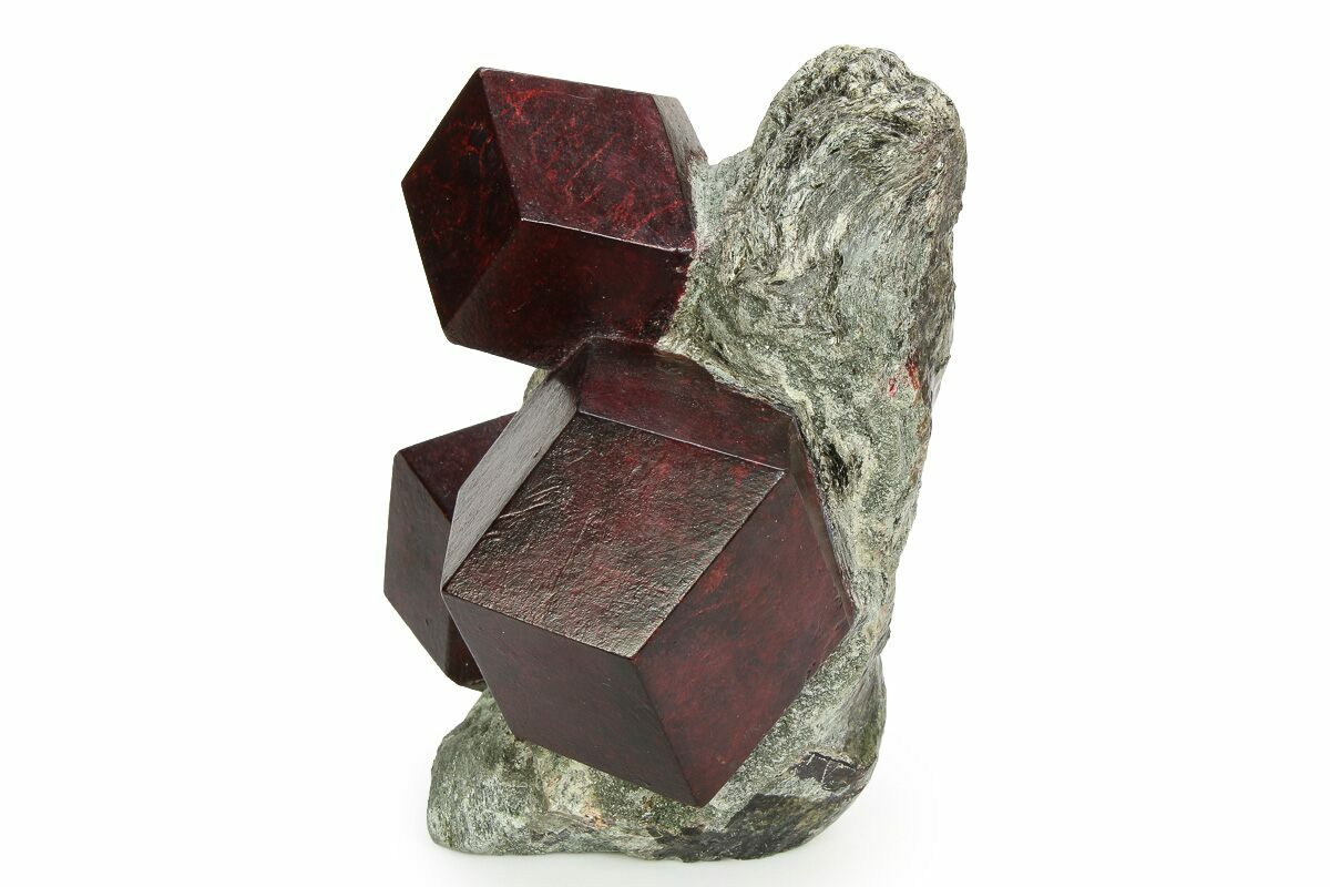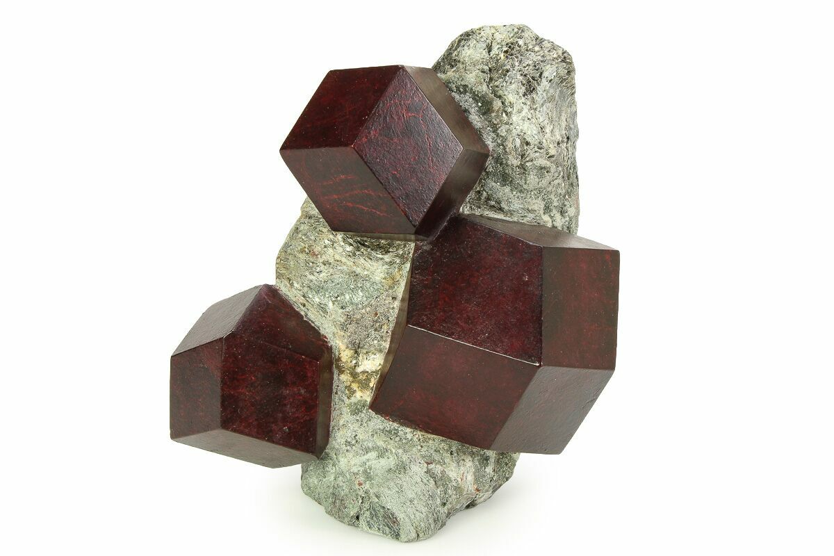 This is an impressive, 4" wide specimen featuring four exposed, brilliant maroon colored almandine garnets within a schist matrix. It was collected from the famous Passo del Rombo of Tyrol, Trentino-Alto Adige, Italy, a location well known for its large and fascinating garnet specimens. The facets on the garnets have been buffed and polished following the meticulous prep to expose them from their schist matrix.