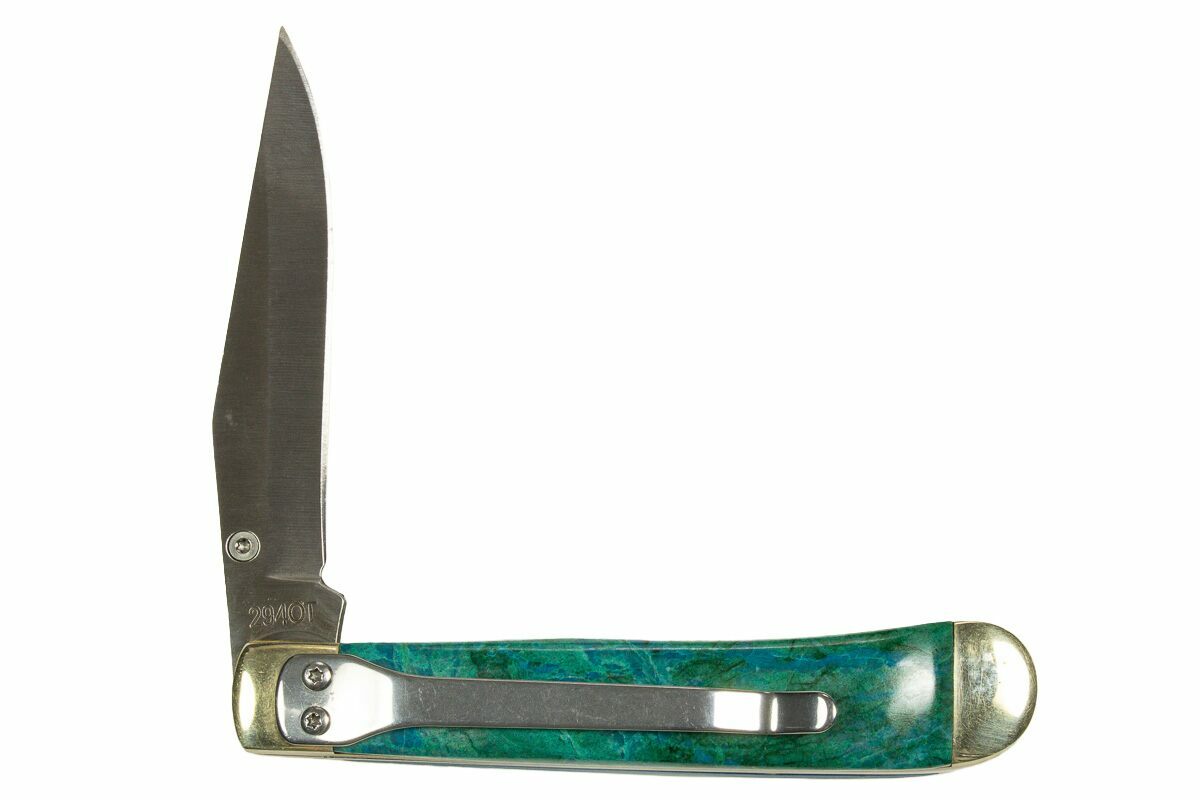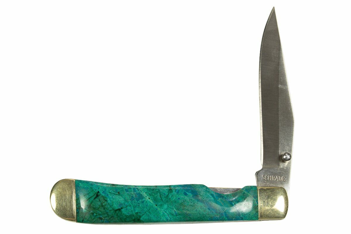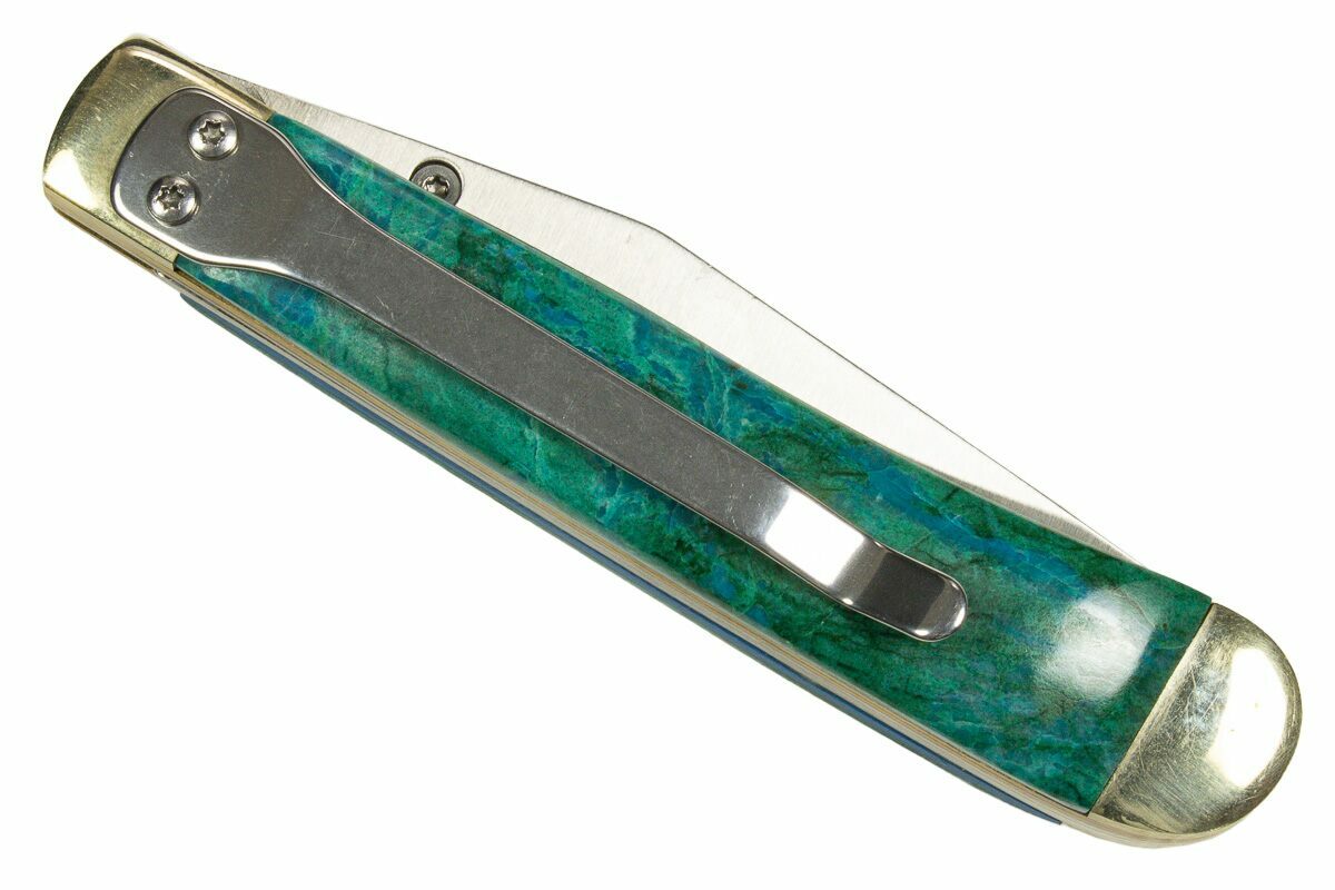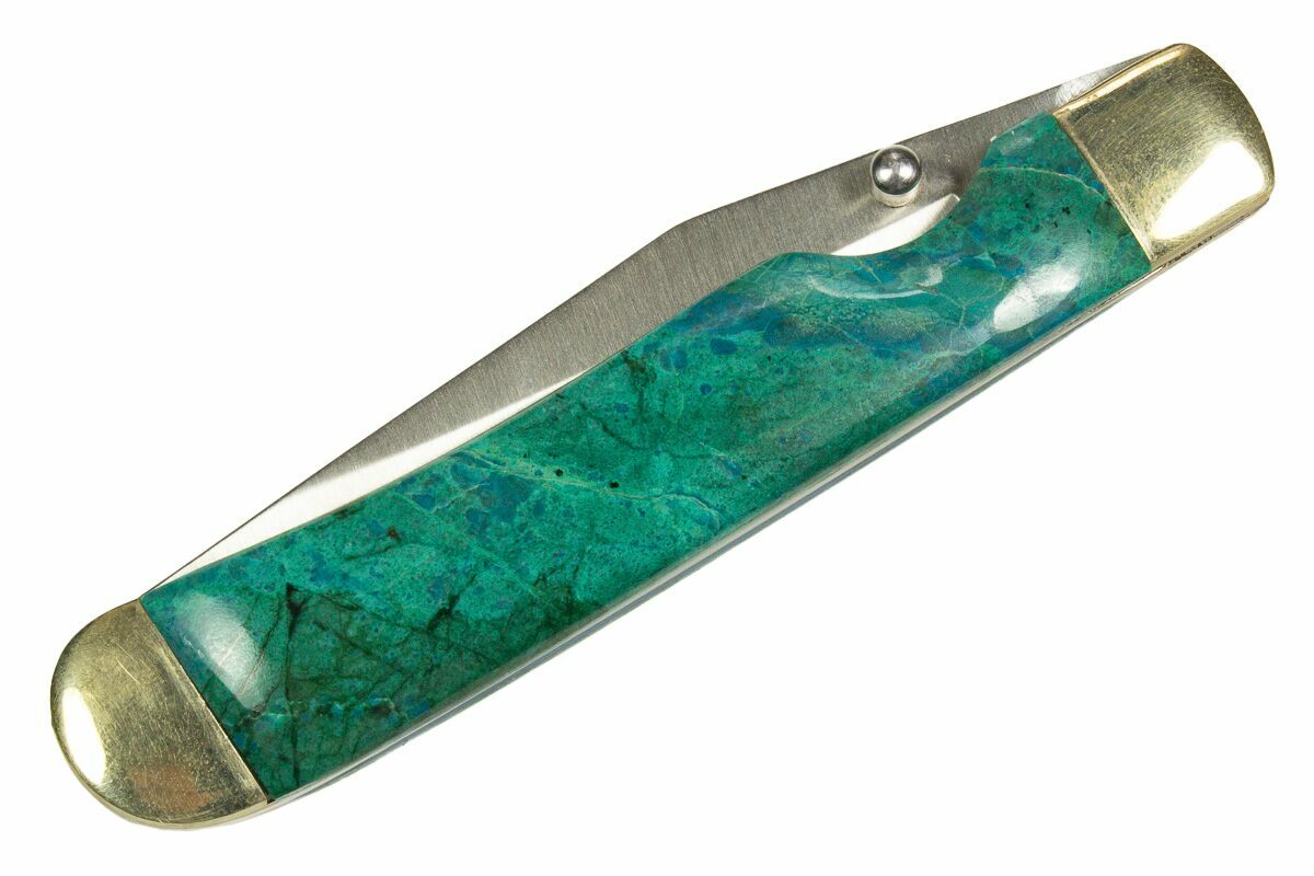 his 4" pocket knife is a captivating blend of fine craftsmanship and natural artistry. Handcrafted in Utah, it features polished inlays of vibrant chrysocolla and rich green malachite—two striking copper-based minerals known for their bold colors and swirling patterns. The deep blues of chrysocolla paired with the banded greens of malachite create a stunning contrast, making each handle a truly one-of-a-kind work of art.