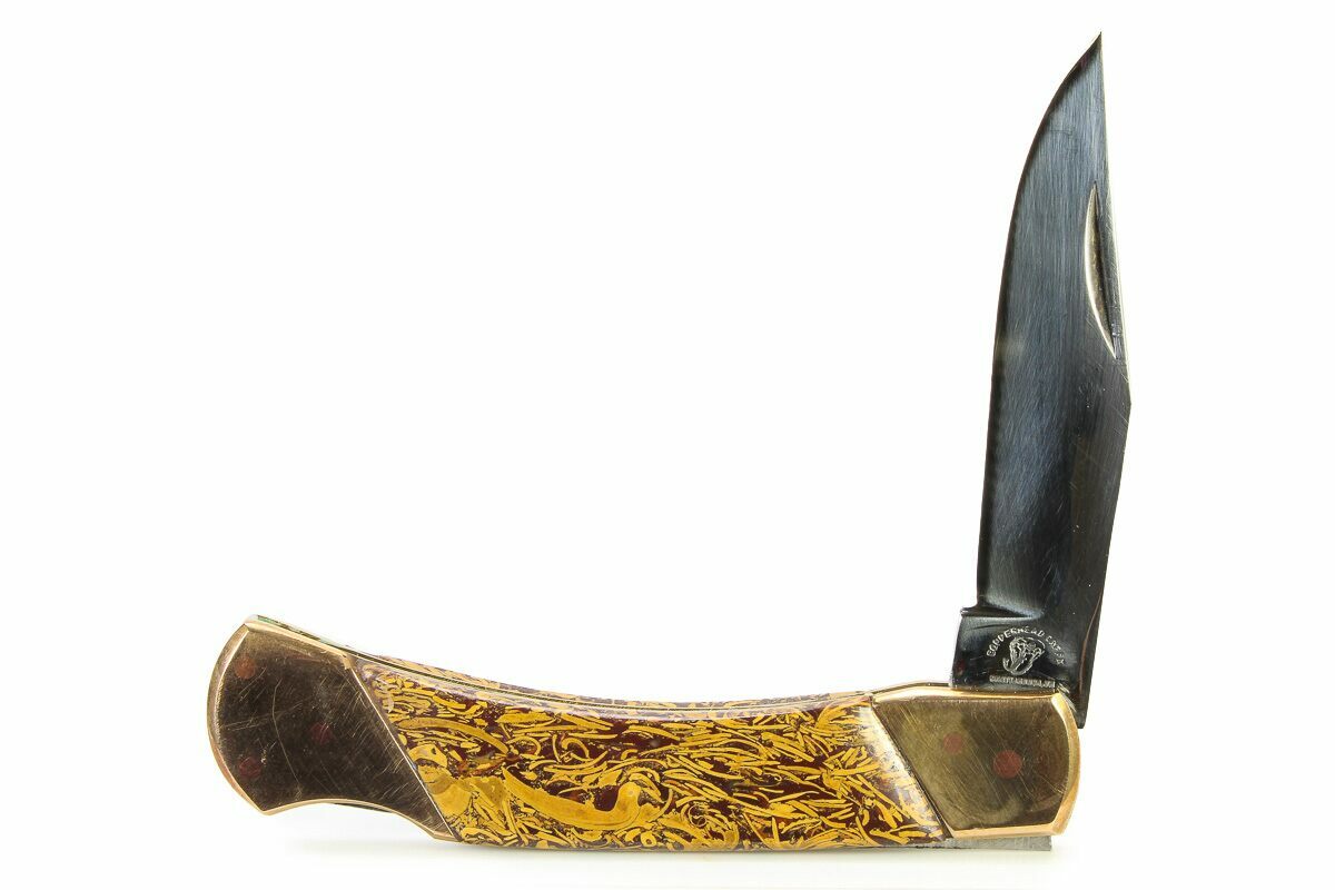 This 4" long high-quality folding pocket knife is a stunning fusion of sleek design and natural elegance. Hand-crafted in Utah, it features polished inlays of miriam stone (coquina jasper) on the handle, a unique sedimentary rock from India known for its bold, swirling patterns of deep red, brown, and orange. Formed over millions of years from fossilized shells and ancient seabeds, miriam stone gives the handle a rich, organic texture that turns this knife into a true work of art.