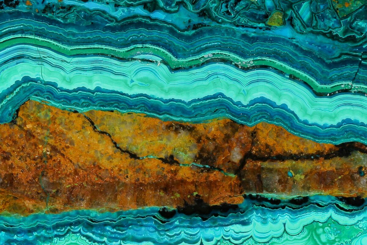Given that chrysocolla is a secondary mineral that will form over other secondary, copper-based minerals, it is unsurprising that most chrysocolla coming out of the Bagdad Mine is in close association with malachite. Both minerals commonly form in fibrous arrays and botryoidal masses that layer nicely over other minerals. Chrysocolla is often an electric blue color whereas malachite tends to be a deep teal to green color. This accounts for the wacky blue-green-teal banding patterns that are typical of copper-based minerals. The addition of quartz increases the visual appeal of these specimens: quartz's crystal habit and clear coloring contrasts wonderfully with the butter-smooth green banding.