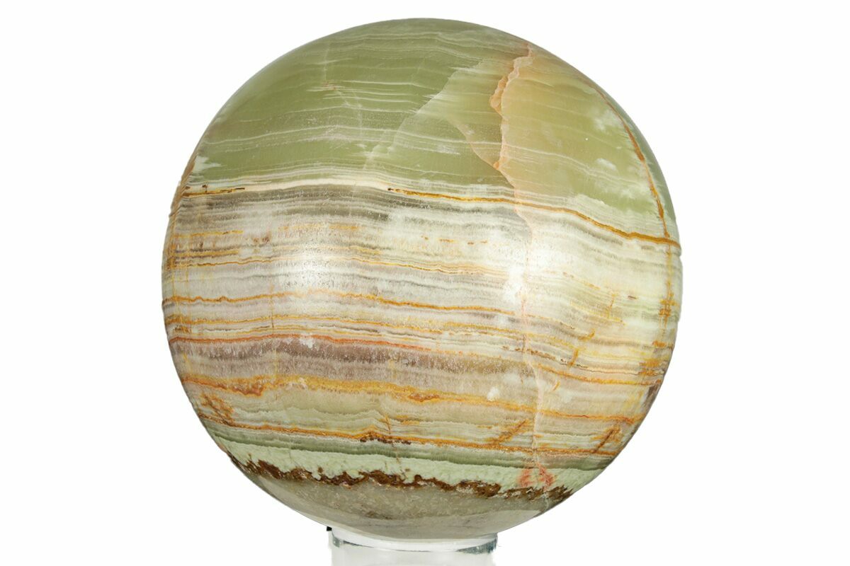 This is a beautiful polished sphere carved from a kind of calcite often (incorrectly) marketed as Pakistan green onyx. The stone has olive green pockets between white, brown, and pink banding. It measures 3.9" in diameter and comes with an acrylic display stand.