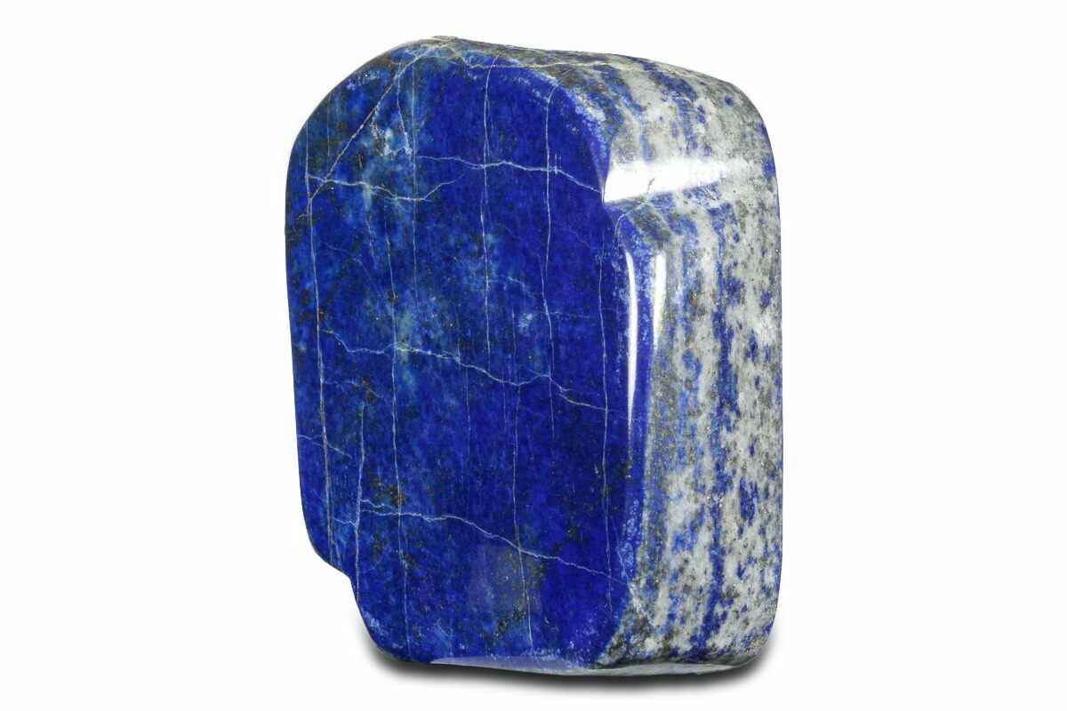 This is a 4" wide, polished piece of lapis lazuli with streaks of sparkling pyrite running through it. This vibrant blue stone was mined from northern Pakistan.