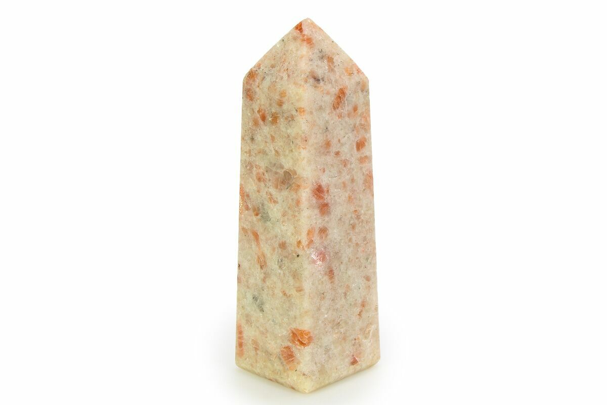 This is a 4" tall polished tower of peach sunstone, a vibrant feldspar known for its warm color and sparkling internal reflections. Sourced from southern India, this material displays soft peach to golden-orange tones accented by tiny, metallic inclusions that create the stone’s signature aventurescence—a shimmering flash that dances across the surface as the tower is rotated in the light.