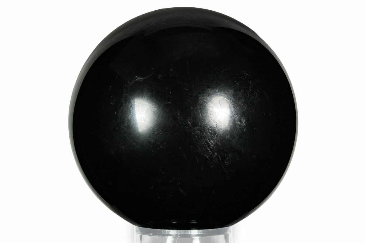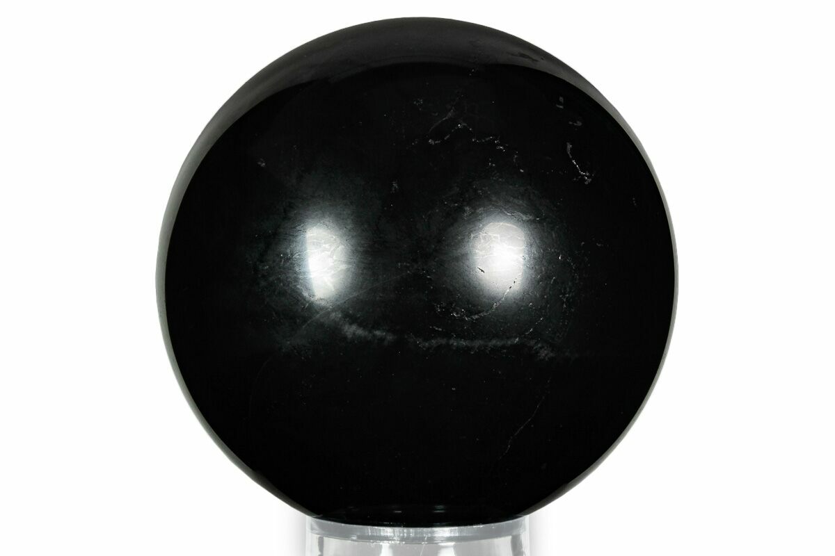 This is a shiny, 4" wide polished sphere of shungite. It comes with an acrylic ring stand.