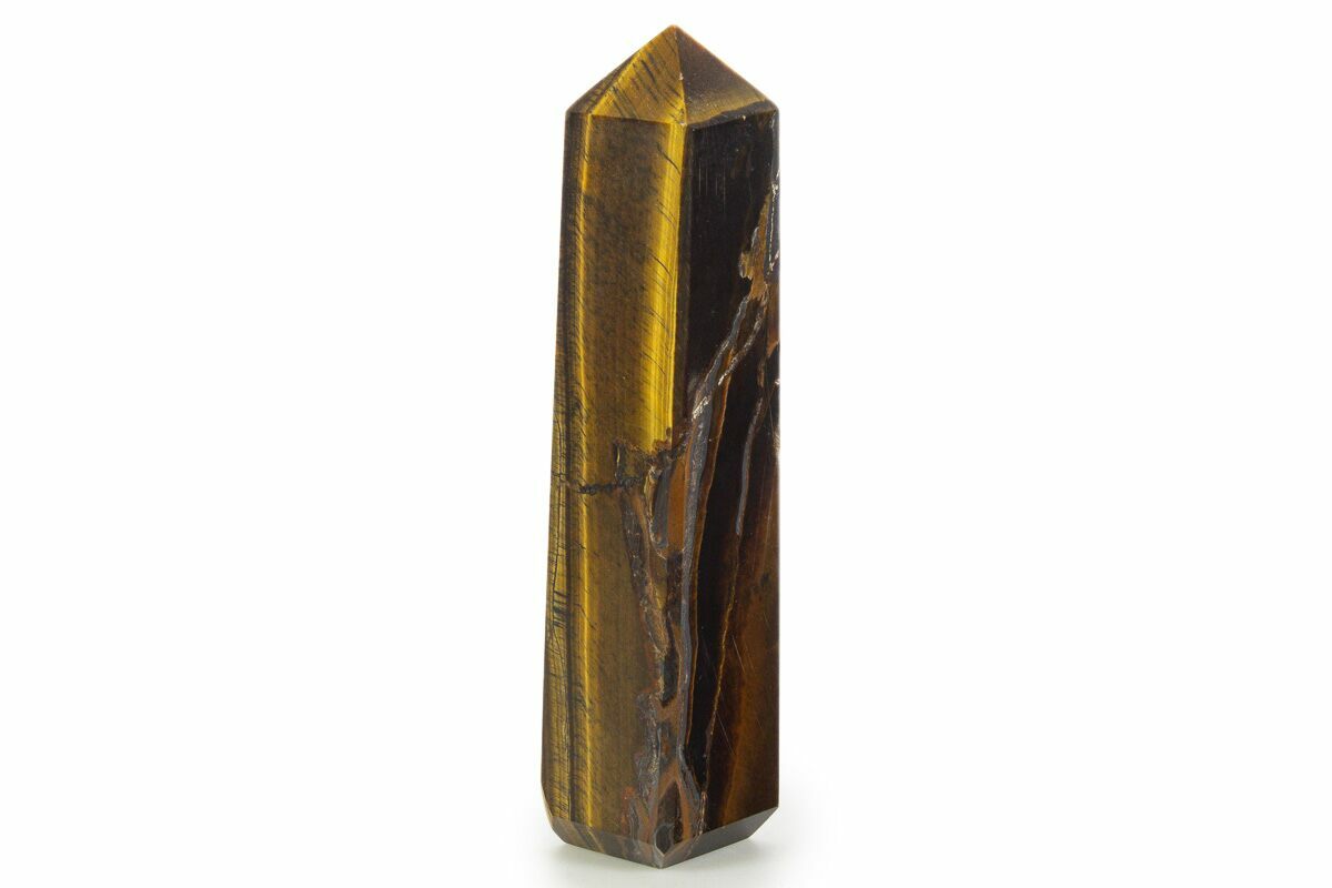 This is a 4" tall, polished tower of tiger’s eye, showcasing the stone’s signature golden-brown chatoyance. Its shimmering bands shift beautifully in the light, creating a striking display of depth and movement. Expertly shaped into a sleek tower, it makes an eye-catching accent for any mineral collection, desk, or shelf.