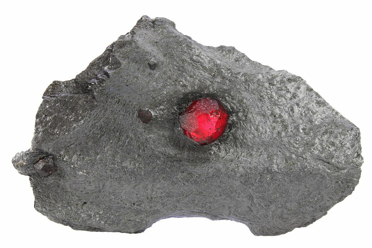 This is a .4" wide almandine garnet that's in a graphite matrix from the Red Embers Mine near Erving, Massachusetts. The graphite matrix has been worked to expose most of the garnet from each side. Small dravite crystals can be found scattered across both sides of the matrix.