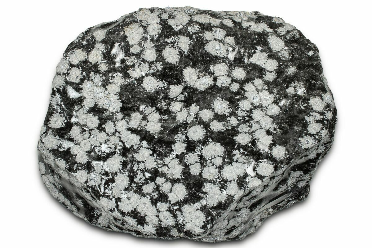 Snowflake obsidian is found near Sevier Lake in Millard County, Utah. It is a natural volcanic "glass" that forms when molten rock cools so quickly that that atoms do not have enough time to arrange themselves into crystals. Instead, the molten material solidifies into an amorphous solid called a glass. The "snowflakes" in the obsidian are small, white, radially clustered crystals of cristobalite, a mineral polymorph of silica.