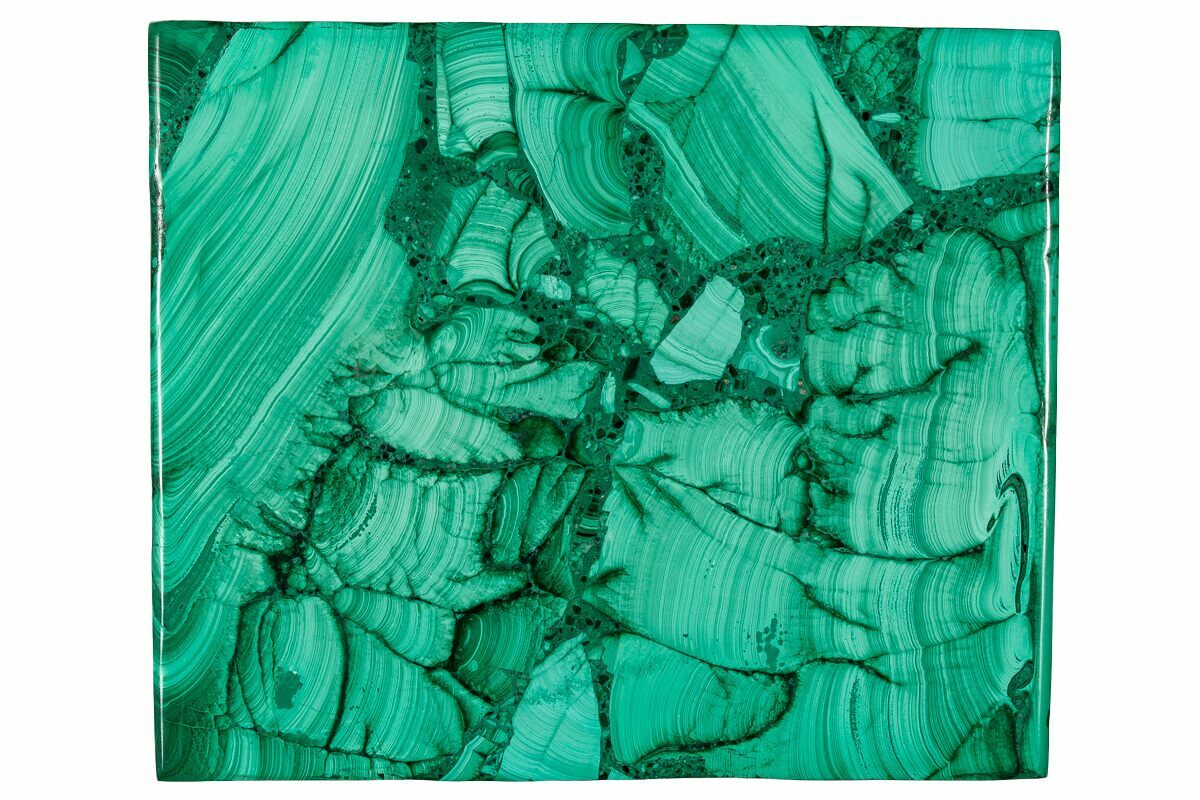 Malachite is an intense green copper-based mineral that can be found in a wide variety of forms. Malachite can grow in botryoidal masses, stalactitic formations, and reniform formations, typically as a tight cluster of fanning fibrous needles that make up a seemingly solid mass. As layers continue to stack during formation, banded patterns can sometimes begin to take shape, explaining the rings in all shades of green seen on most polished malachite specimens.