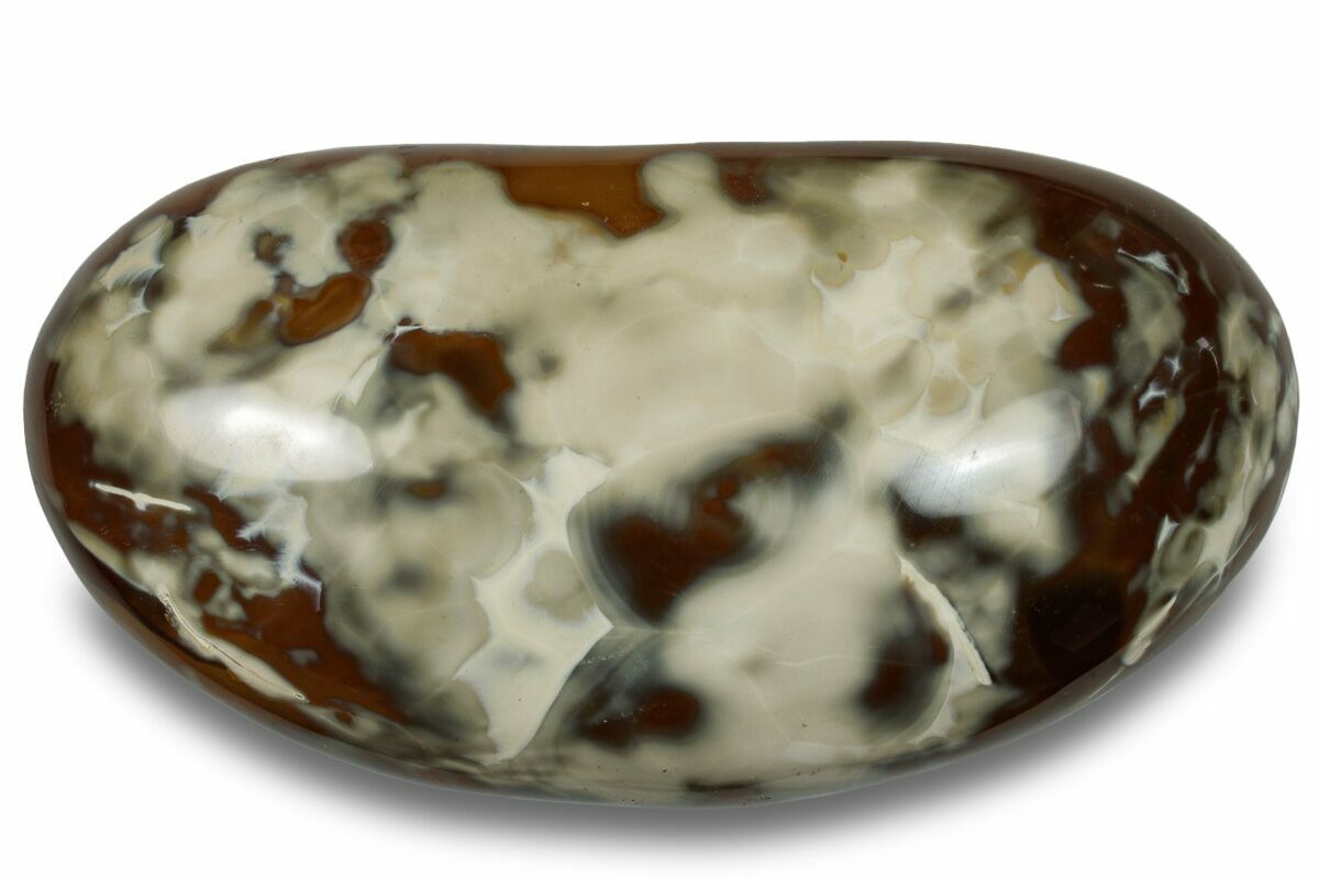 This is a richly colored polished palm stone, shaped from carnelian agate. The carnelian is mined in Madagascar and has bands and spots in wonderful deep brown, orange, and white colors.