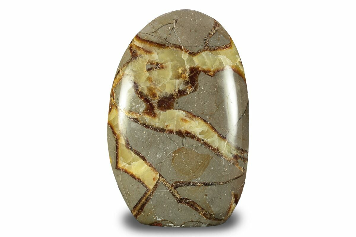 This is a beautiful polished free-form sculpture carved from septarian. The septarian comes from the Betsiboka Region of Madagascar and was deposited during the Jurassic period. The base of this sculpture has been cut flat to display without the use of a stand.