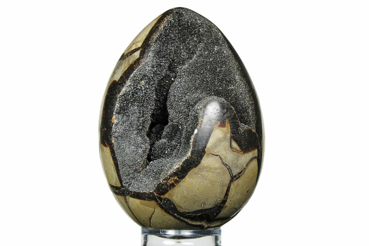 This is a really cool Septarian "Dragon Egg" geode collected in the Betsiboka Region of Madagascar. The hollow cavity is full of beautiful calcite crystals. It is a hollow septarian nodule, which has been polished into an egg shape, and the natural cracked pattern of the septarian gives it the appearance of a dragons egg. A spectacular display piece which would look great in your home/office, or make a great gift for the Game of Thrones enthusiast you know.