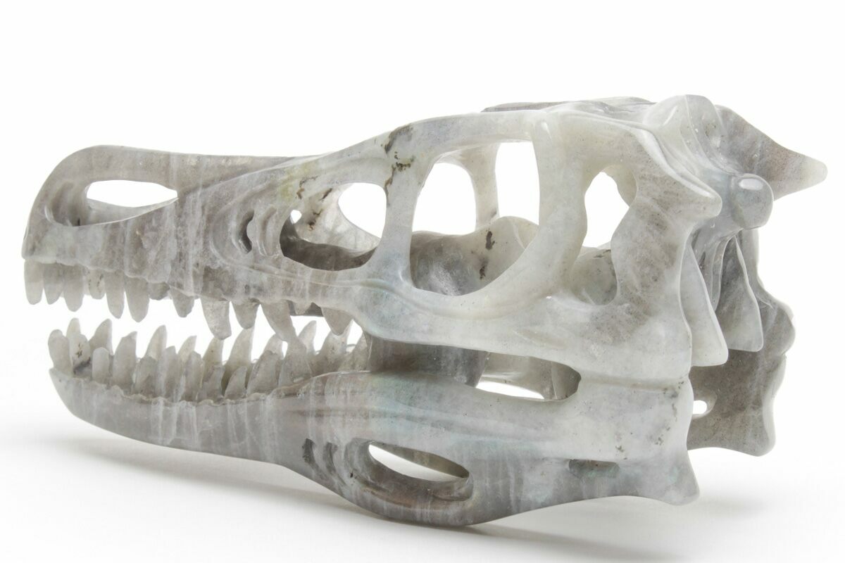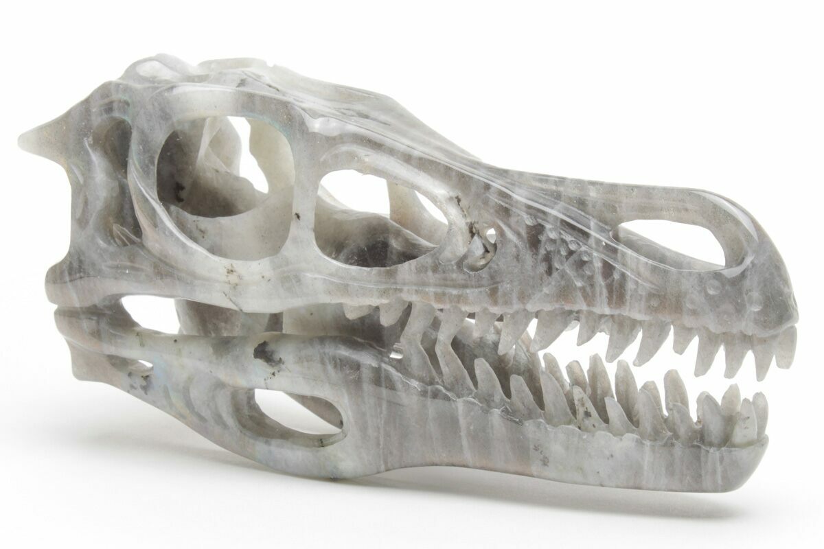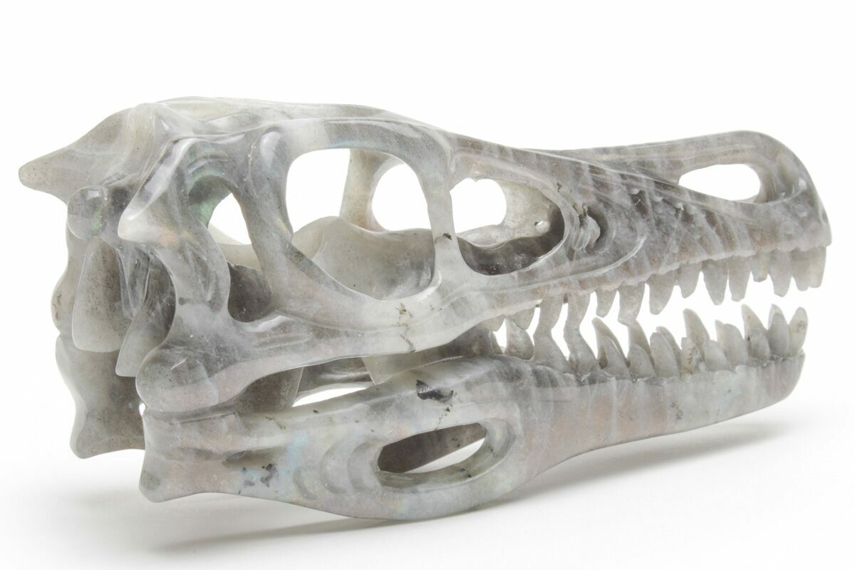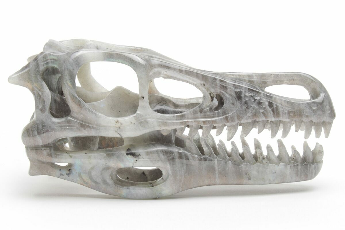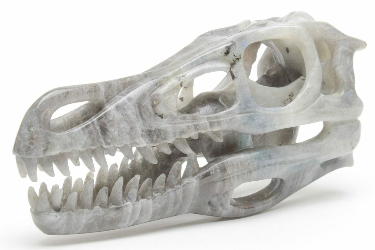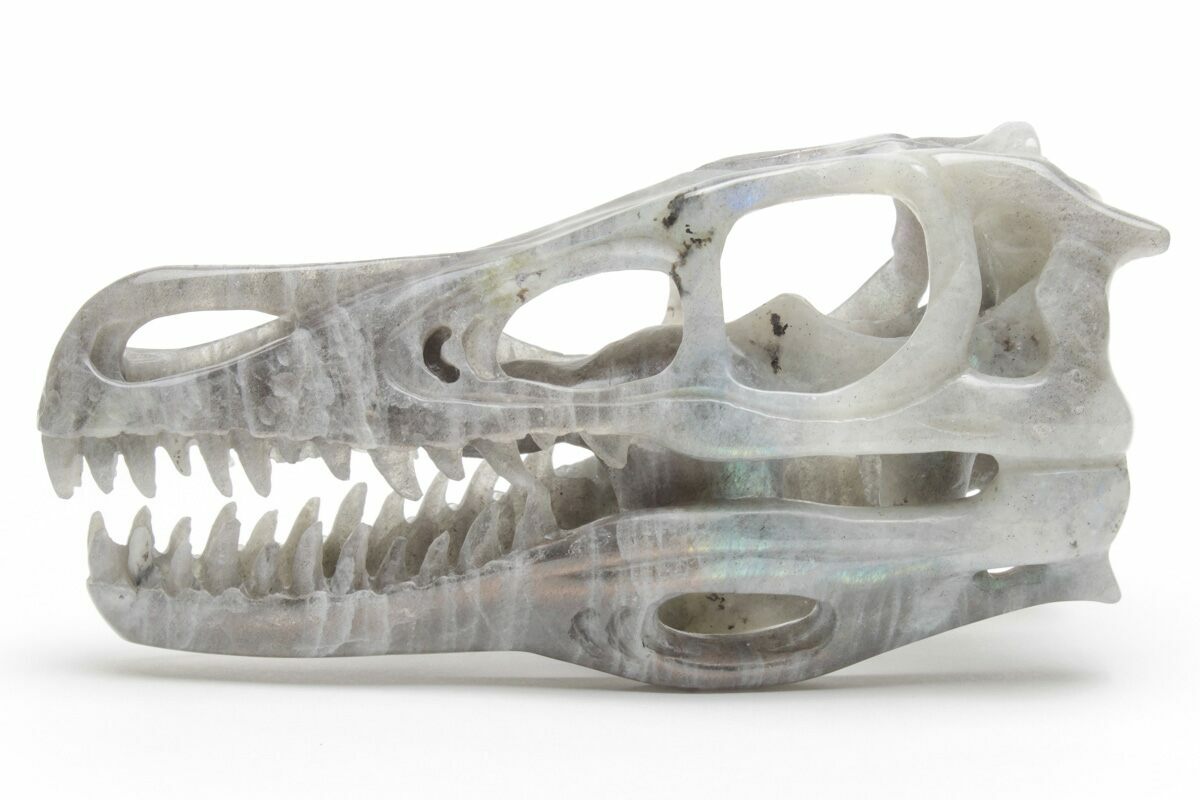As if raptors weren't already mind-bogglingly awesome enough, we decided to add a whole other layer of intrigue and fantasy. This is a wild piece that is sure to excite any collector and is destined to be the envy of your social circle. What we have for you is an exquisitely-crafted, polished, 5.1" long raptor skull that's meticulously carved from labradorite. The brilliant blue, green, purple, and gold labradoresent colors dance in the light, giving this specimen an entirely different personality when viewed from different angles and lighting.