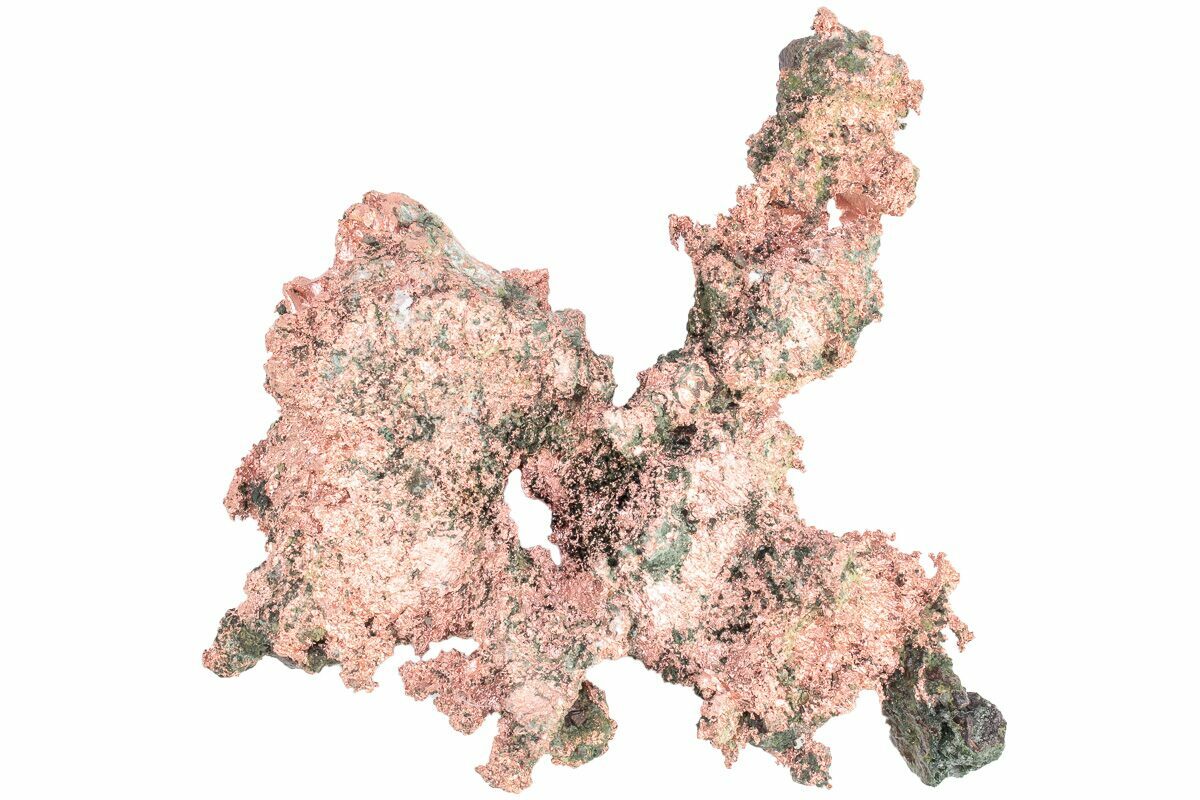 Native copper occurs rarely as isometric cubic and octahedral crystals, but more typically as irregular masses and fracture fillings. It has a reddish, orangish, and/or brownish color on fresh surfaces, but typically is weathered and coated with a green tarnish of copper carbonate.
