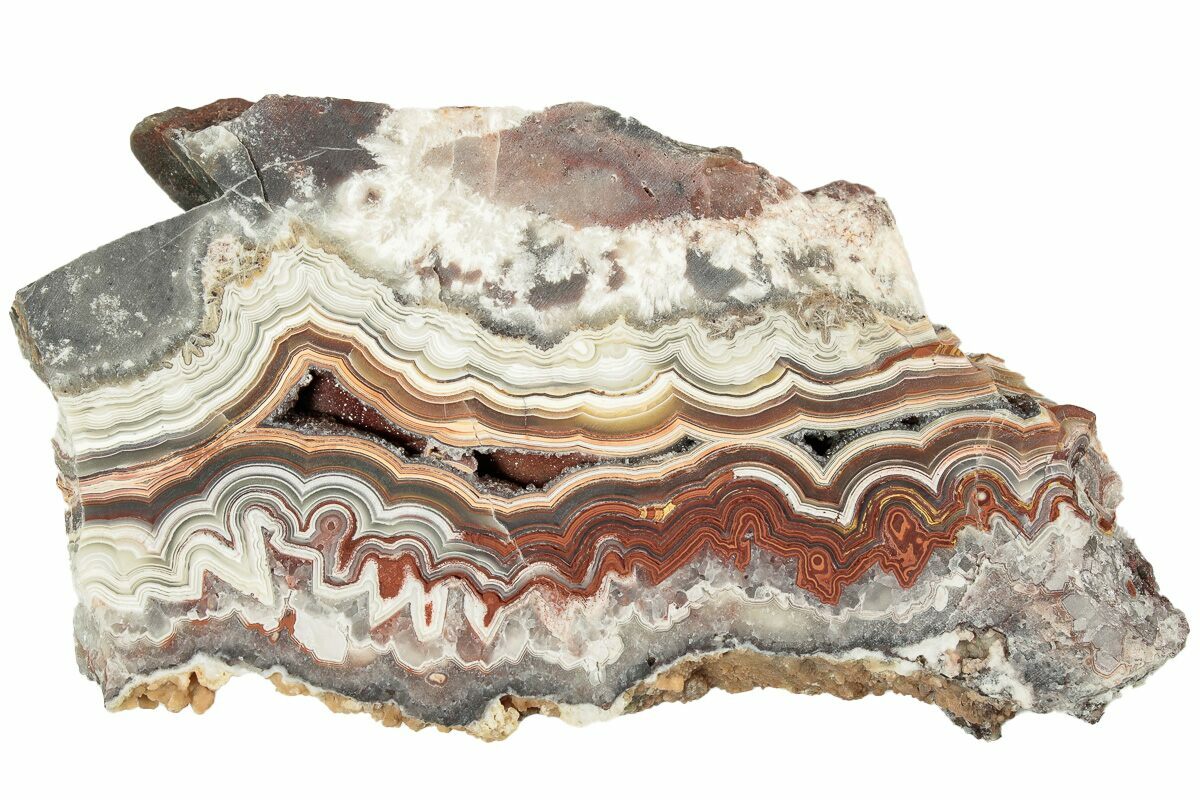 Crazy lace agate, also known as Mexican Agate, is a unique banded agate that comes from Chihuahua, Mexico. It gets its name from complex, lacy patterns swirling through the stone. Colors can vary from cream and orange to red, and are caused by iron and aluminum inclusions in the agate.