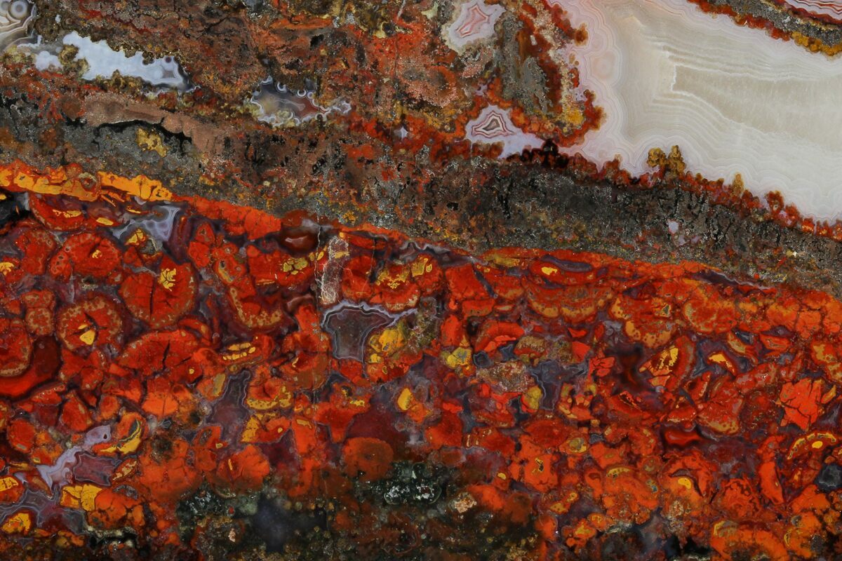 Cruentus agate is the trade name for an agate formation that features vibrant red coloration and occurs in small cavities, veins, or seams in rock. Cruentus is Latin for blood-stained or bloody, which is fitting considering the red coloration strongly resembles the color of blood. These seams often occur in areas where the rock has naturally shifted or fractured, creating cavities that fill in with minerals. Seam agates like this collected from Morocco come out of the Atlas Mountain region near Kerrouchen (also spelled Karouchen or Kerrouchene).