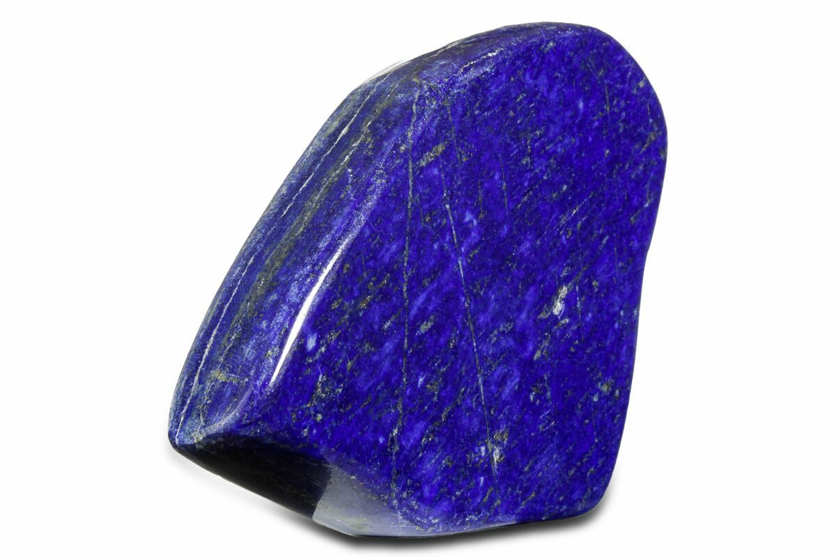 This is a 5.1" wide, polished piece of lapis lazuli with streaks of sparkling pyrite running through it. This vibrant blue stone was mined from northern Pakistan.