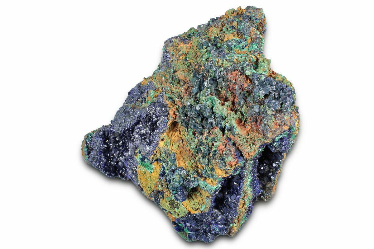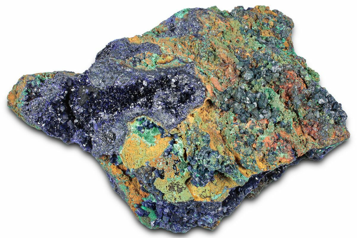 Azurite and malachite are two closely related copper minerals that frequently form together, creating some of the most striking natural color combinations found in the mineral world. Because their chemical compositions are so similar, only subtle changes in the environment during formation—especially the amount of water present—can influence which mineral becomes more dominant. Conditions with greater moisture tend to favor the development of malachite, while drier settings allow azurite to accumulate more readily.