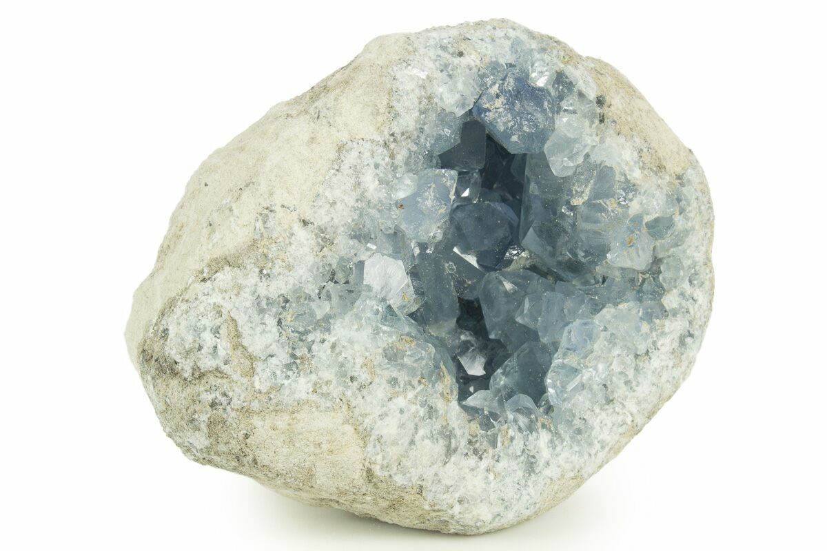 Celestite (or celestine) is a mineral consisting of strontium sulfate (SrSO4). It tends to form attractive, well-shaped crystals that are often found inside of geodes. One of the main sources of celestine is the deposits on the northwestern coast of Madagascar.
