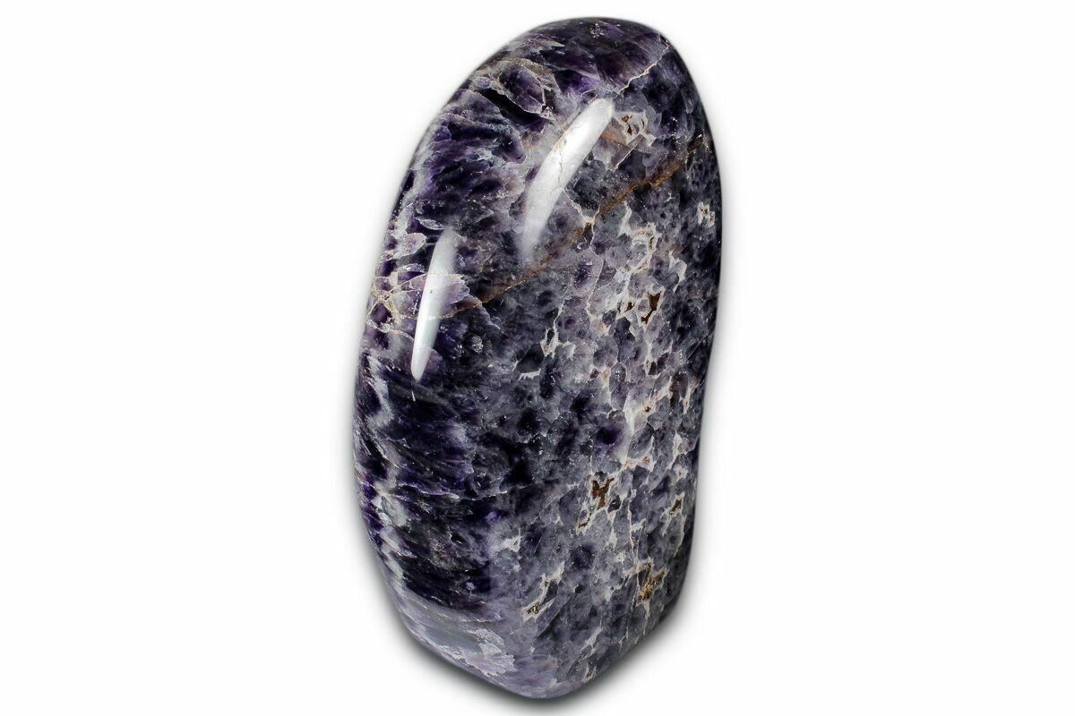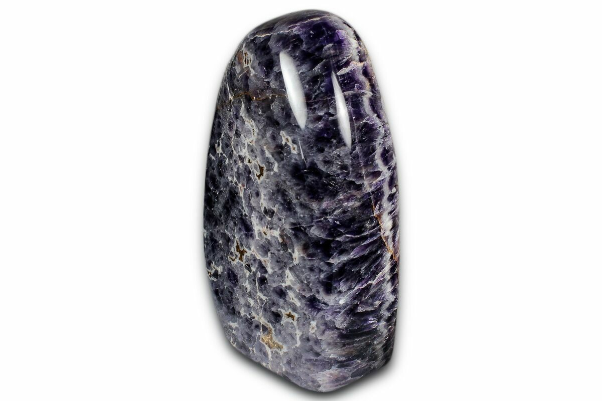 This is a beautiful, 5.1" tall, free-standing sculpture made from a deep-purple amethyst formation known as chevron amethyst. The bottom of the specimen has been cut flat so that it stands nicely on its own. This specimen was collected, cut, and polished in Madagascar.