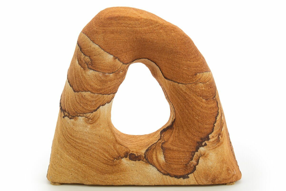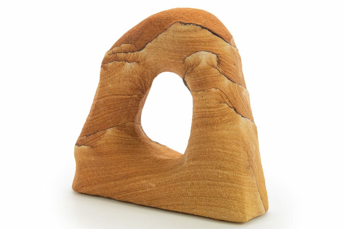This is a 5.15" wide Toroweap picture sandstone arch. This stunning and distinctive sandstone, mined near Snowflake, Arizona, has been artistically crafted into an arch shape, inspired by natural sandstone formations like Delicate Arch in Arches National Park. The base of this specimen has been cut flat for vertical presentation.