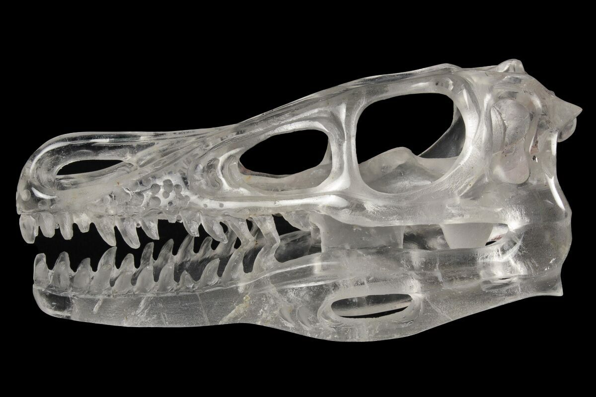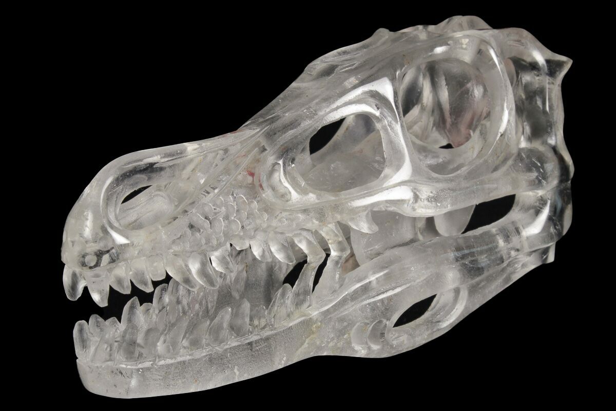 As if raptors weren't already mind-bogglingly awesome enough, we decided to add a whole other layer of intrigue and fantasy. This is a wild piece that is sure to excite any collector and is destined to be the envy of your social circle. What we have for you is an exquisitely-crafted, polished, 5.2" long raptor skull that's meticulously carved out of clear quartz crystal.