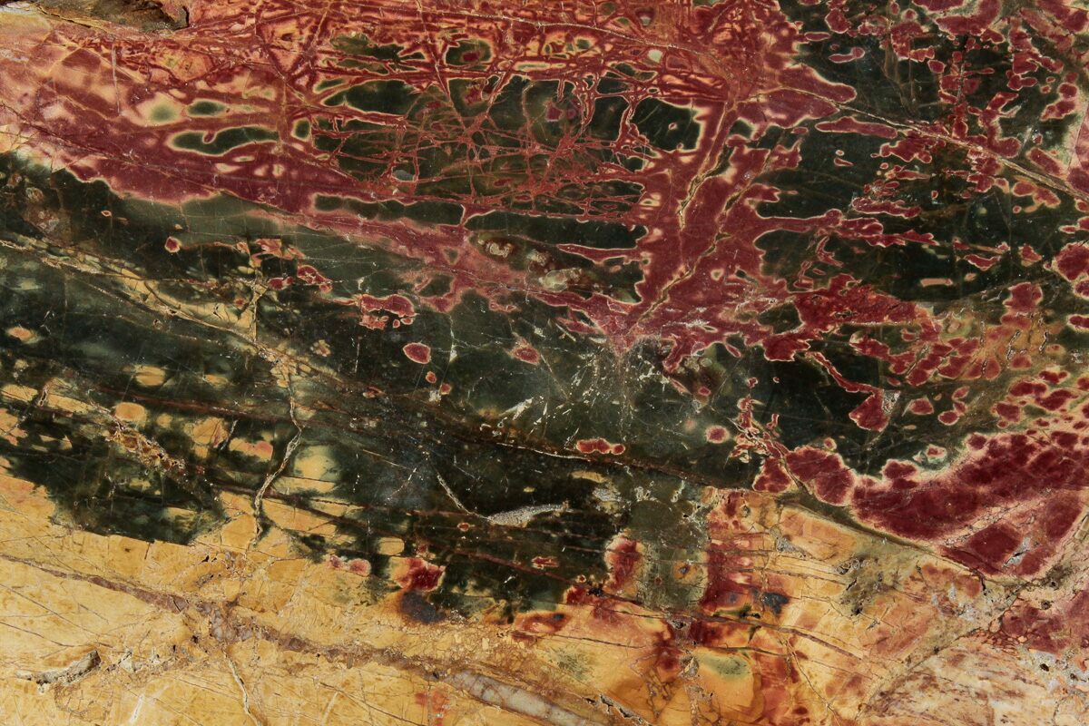 This is a colorful section of cherry creek jasper collected from China. It measures 5.2" wide and has been cut flat and polished to a glossy finish on one side.