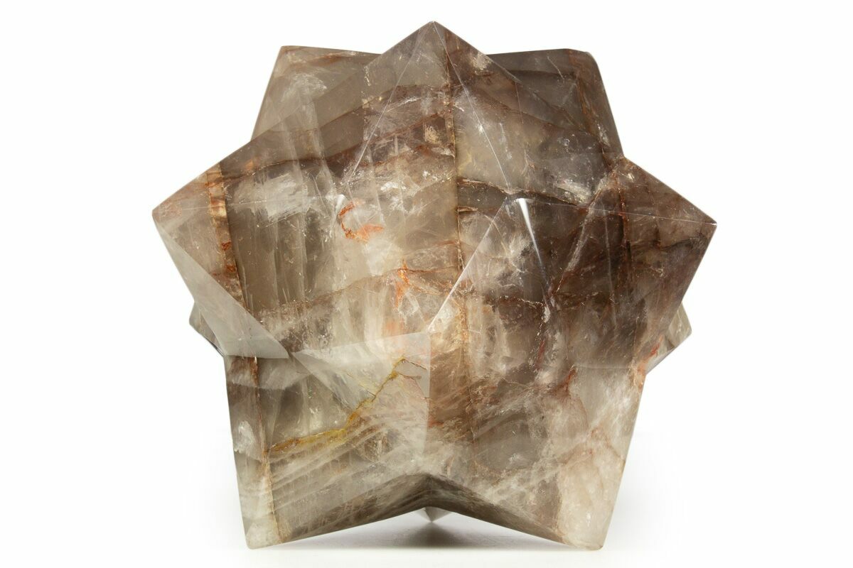 This is a 5.2" wide polished 12 point star (stellated dodecahedron) hand-carved from hematite quartz, frequently referred to as harlequin quartz. The coloration is a wonderful combination of deep oranges and reds.