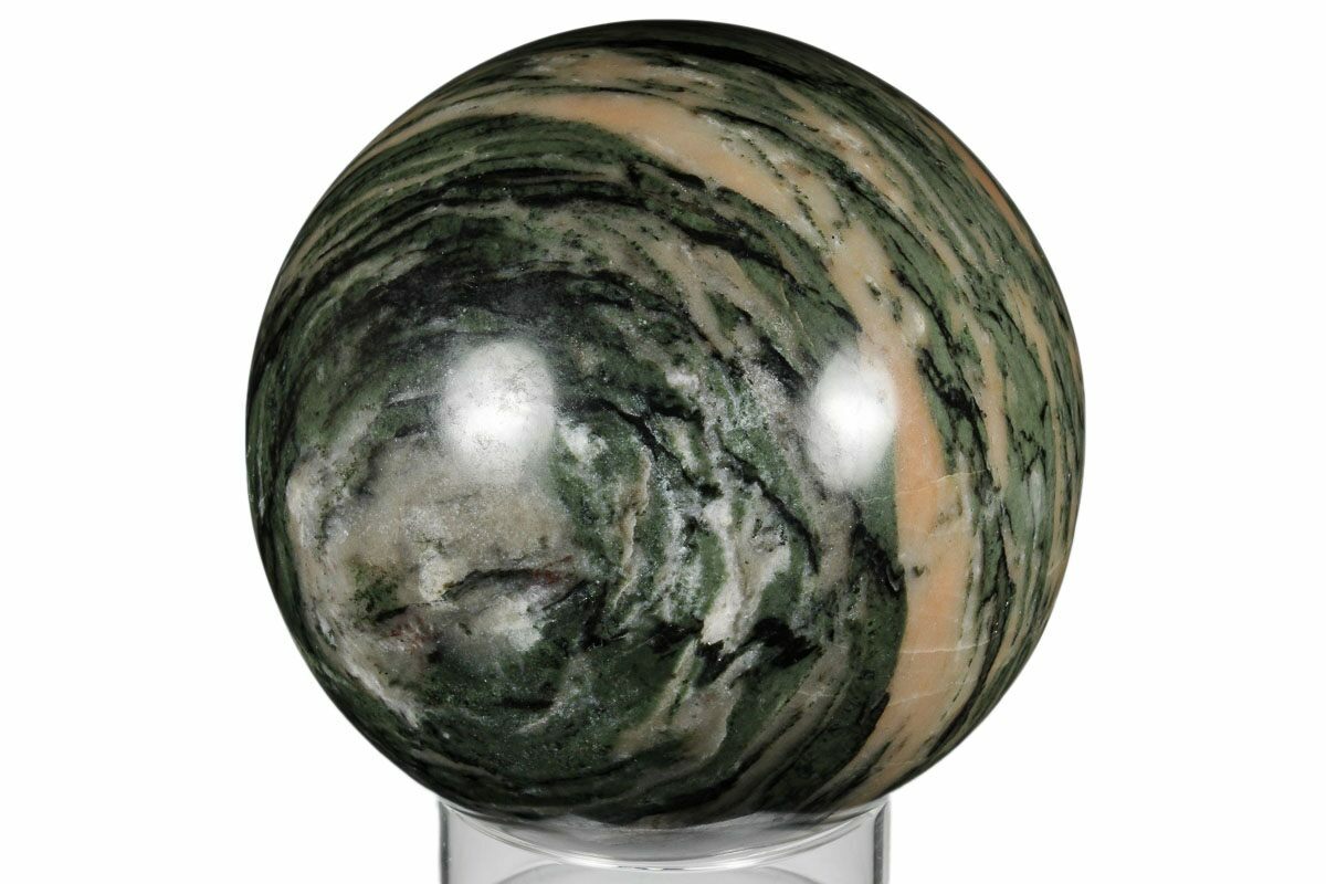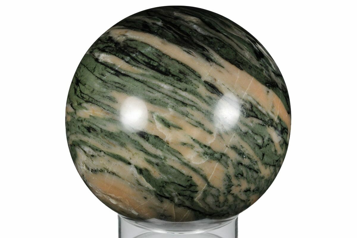 This is a large, 5.2" wide polished sphere of pink zebra calcite from Madagascar. It has been polished to a glossy finish and comes with a wooden display stand.