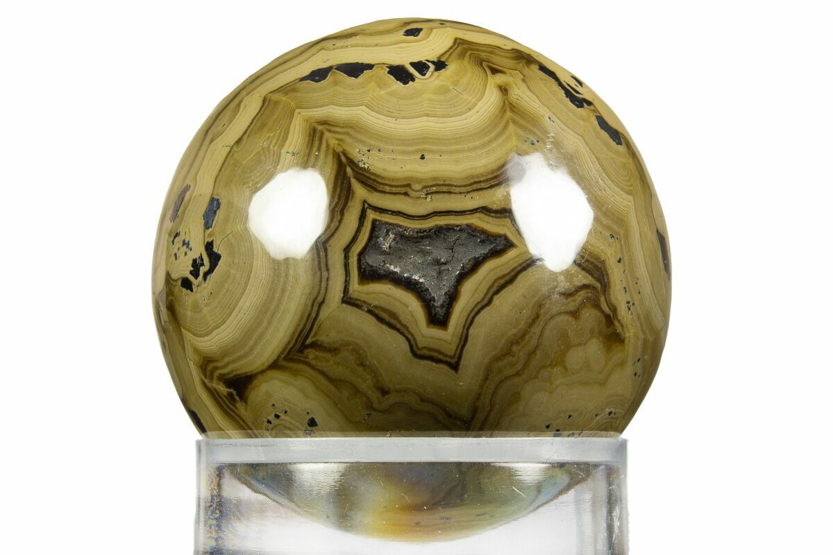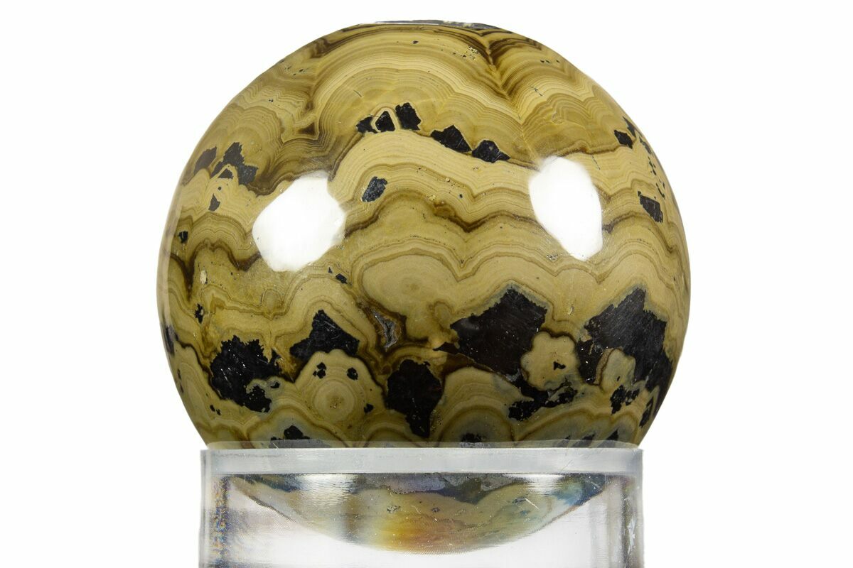 This particular specimen was mined out of the Pomorzany Mine in Olkusz, Poland and contains a beautiful combination of sphalerite, marcasite, and galena. It has been shaped into a sphere and flawlessly polished to a glossy finish all the way around.
