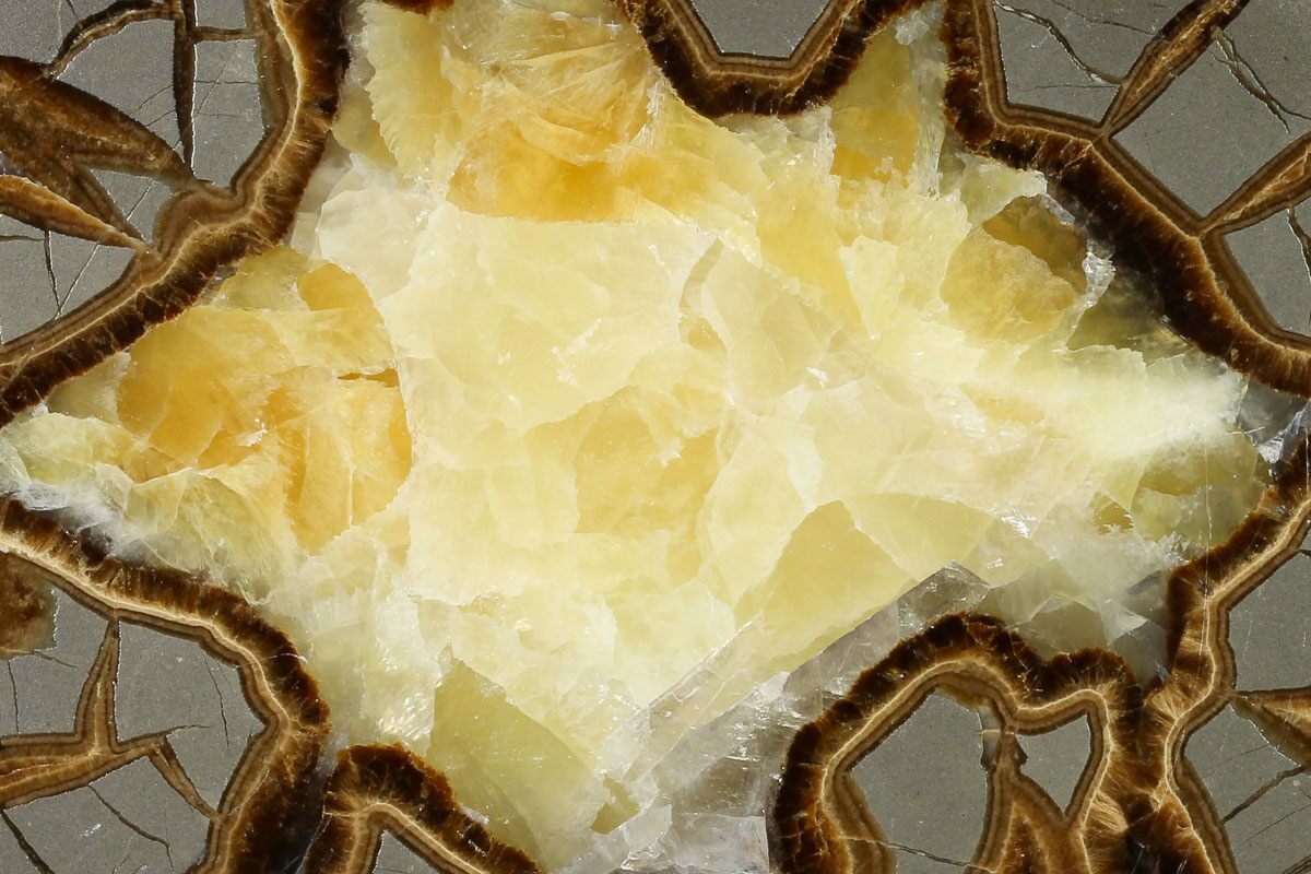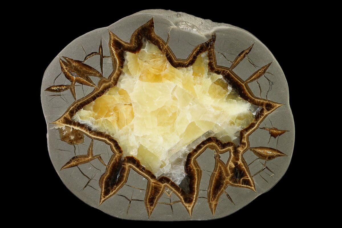 This is a beautiful polished slice from a septarian nodule. This septarian was mined West of Orderville, Utah and was deposited during the Late Cretaceous, about 100 million years ago. The contrast between the grey limestone, yellow calcite crystals and brown aragonite is quite stunning. It's been polished on one side and displays well on the included display stand.