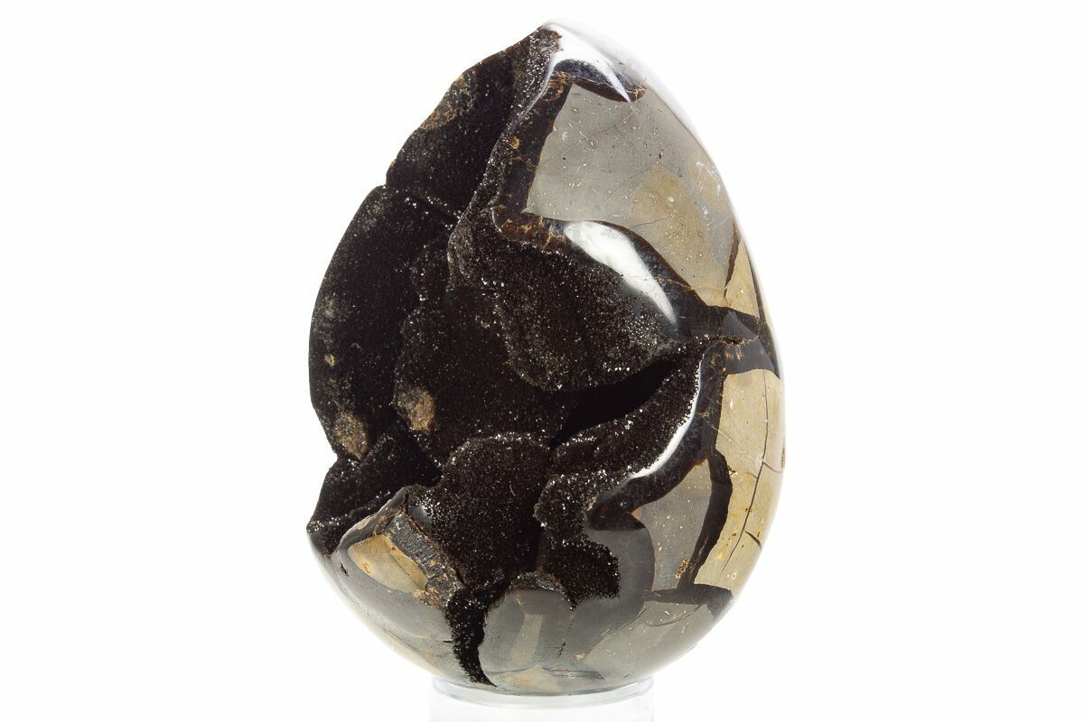 This is a gorgeous septarian "dragon egg" geode collected in the Betsiboka Region of Madagascar. The hollow cavity is full of beautiful, sparkling black & brown calcite crystals. It is a hollow septarian nodule which has been polished into an egg shape, and the natural cracked pattern of the septarian gives it the appearance of a dragons egg. A spectacular display piece which would look great in your home/office or make a great gift for the Game of Thrones enthusiast you know.