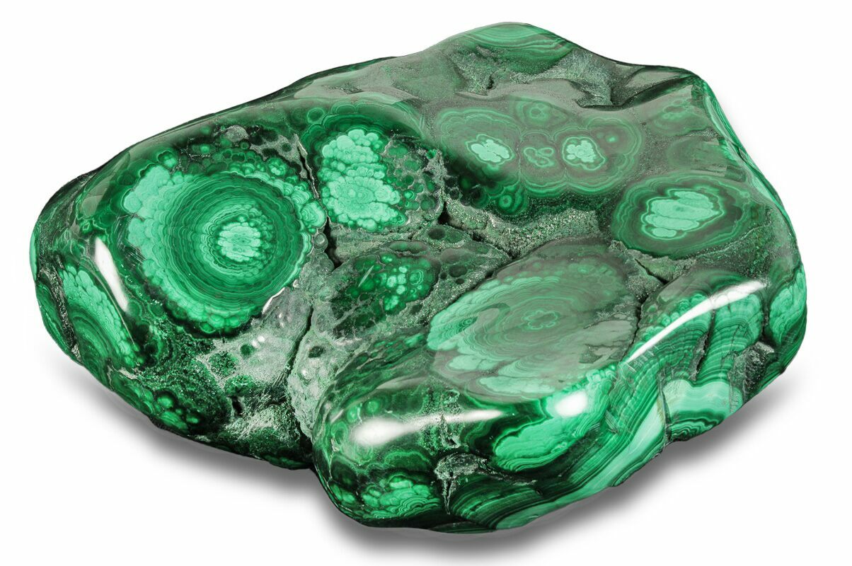 Malachite is an intense green copper-based mineral that can be found in a wide variety of forms. Malachite can grow in botryoidal masses, stalactitic formations, and reniform formations, typically as a tight cluster of fanning fibrous needles that make up a seemingly solid mass. As layers continue to stack during formation, banded patterns can sometimes begin to take shape, explaining the rings in all shades of green seen on most polished malachite specimens.