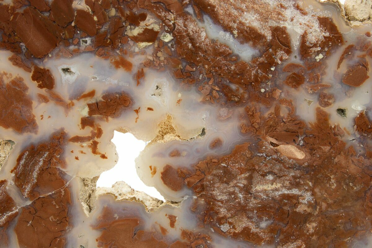 This is a 5.25" wide polished slab of youngite that was collected near Guernsey in Platte County, Wyoming. Youngite is a brecciated jasper that is often found encrusted in chalcedony. Under shortwave UV, this agate fluoresces a white-blue color.