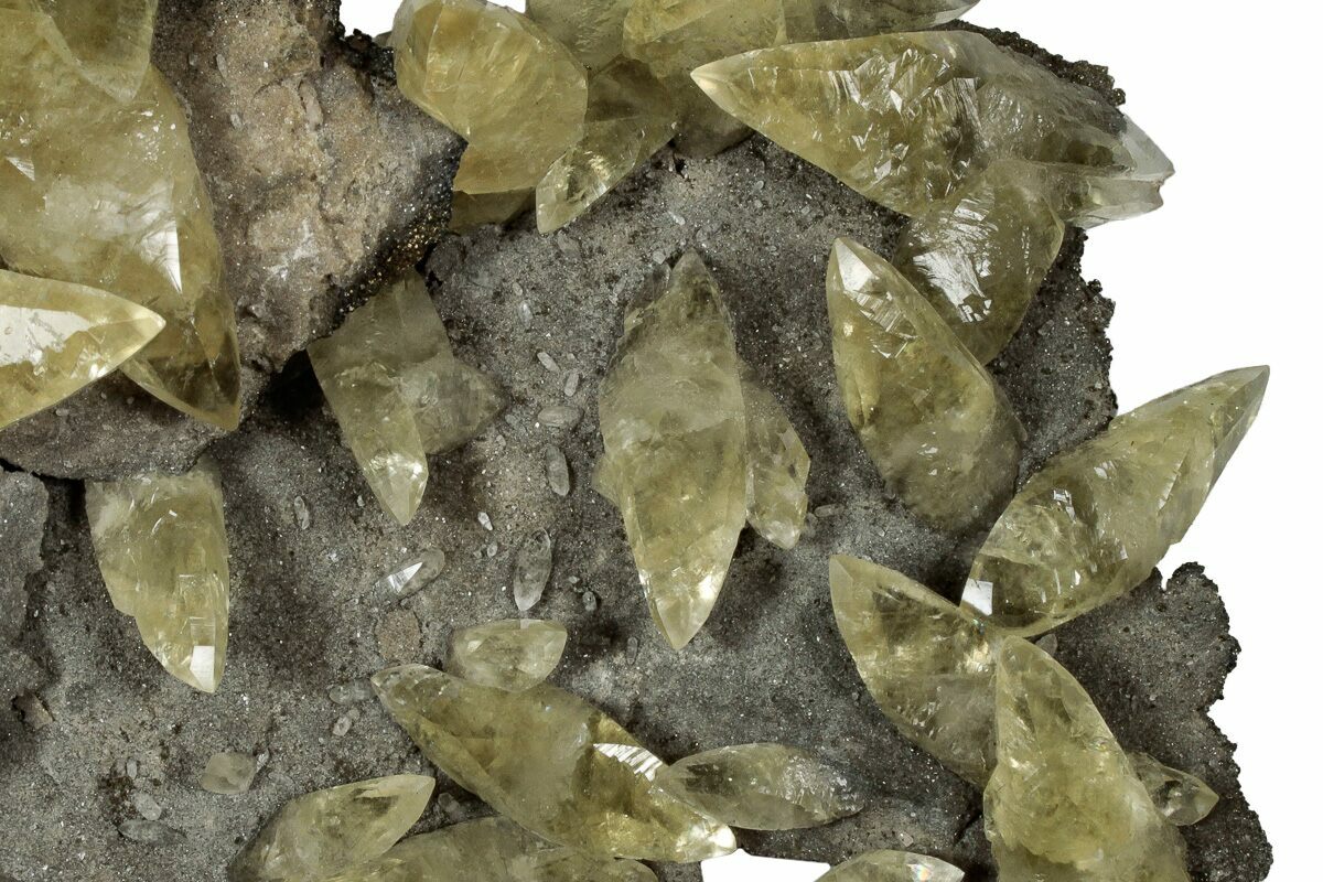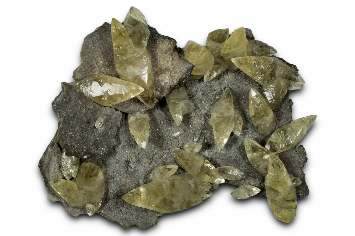 This is a gorgeous, 5.3" wide cluster of double-terminated yellow calcite crystals scattered across their natural matrix. The calcites show exceptional luster and clarity, with pristine terminations on the majority of the crystals. This mineral specimen was collected from the Sweetwater Mine in Reynolds County, Missouri, a site known for its stunning mineral associations. Aggregations of tiny pyrite cubes on dolomite can be found across the underside of the matrix.