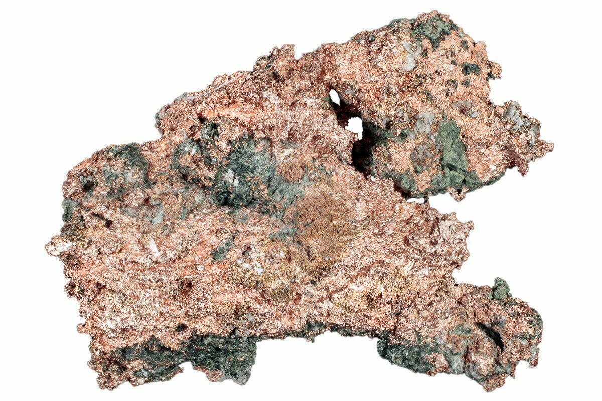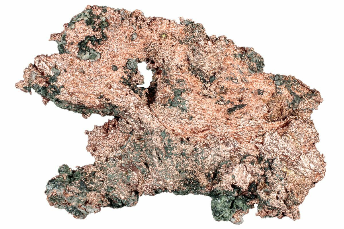 Native copper occurs rarely as isometric cubic and octahedral crystals, but more typically as irregular masses and fracture fillings. It has a reddish, orangish, and/or brownish color on fresh surfaces, but typically is weathered and coated with a green tarnish of copper carbonate.